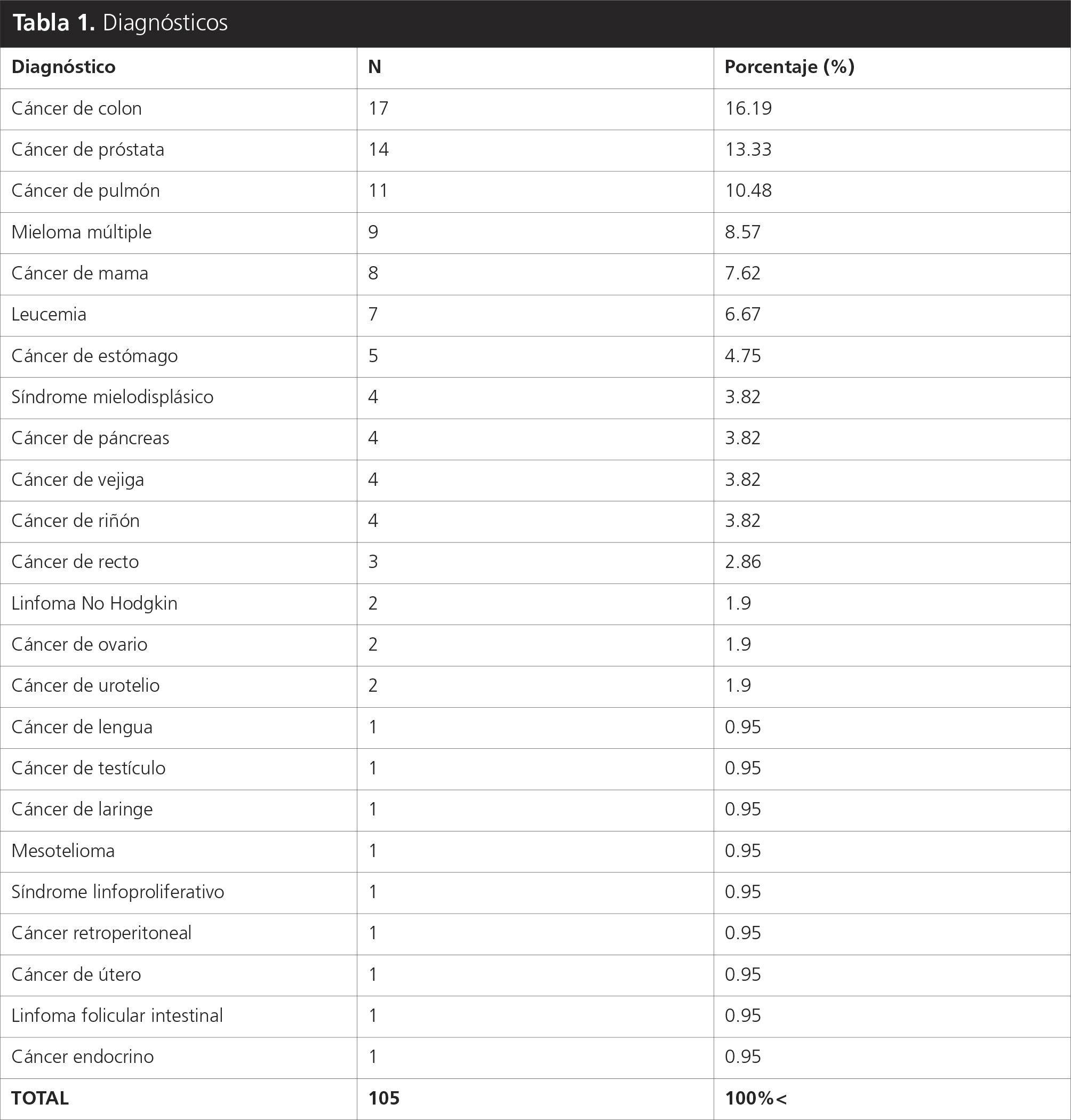 Se incluyeron 105 pacientes entre marzo y octubre de 2020. La edad promedio fue de 67.7 años (rango 19-90 años). 67 pacientes fueron de sexo masculino (64%); 79 tenían tumores sólidos (73%) y los restantes (27%) correspondían a enfermedades oncohematológicas. Todos los pacientes, que residían en el Área Metropolitana de Buenos Aires (AMBA), fueron seguidos durante el período en el que se encontraron en el servicio de quimioterapia domiciliaria. Los diagnósticos se detallan en la tabla 1.