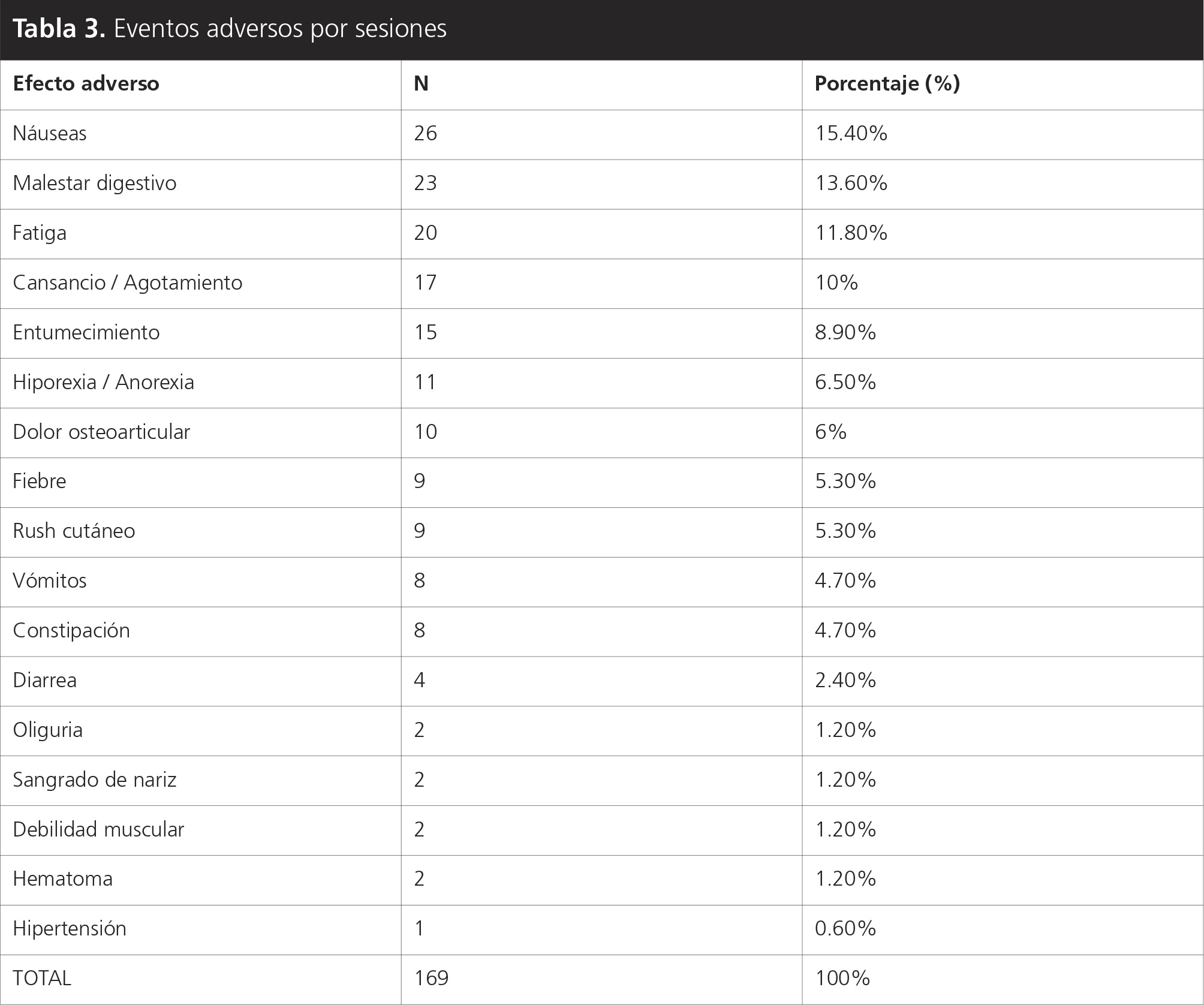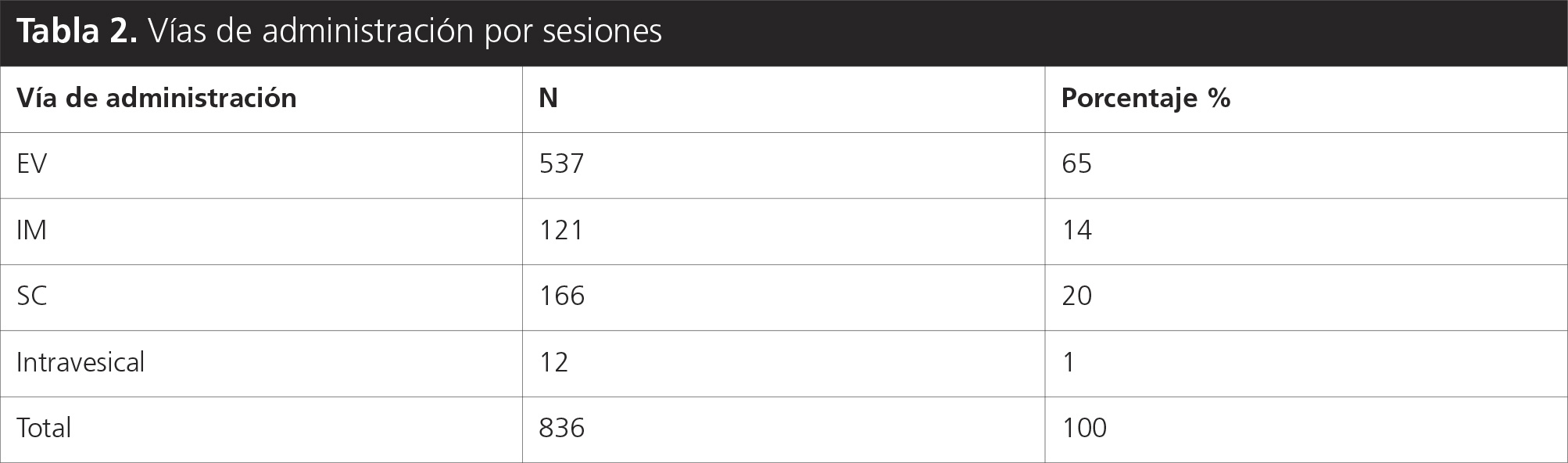 El total de sesiones de tratamiento realizadas fueron 836 (7.9 sesiones promedio por paciente). Las vías de administración de los tratamientos fueron: IV, IM, SC o intravesicales (Tabla 2).