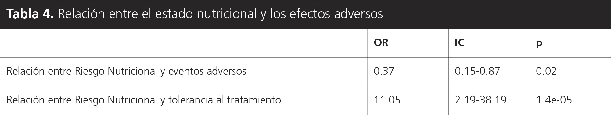 Se realizó un análisis de correlación entre el estado nutricional y los eventos adversos de los pacientes, y también con la tolerancia reportada por estos al tratamiento. En relación con la aparición de eventos adversos, no se observaron diferencias estadísticamente significativas. En el caso de la tolerancia se observó una asociación estadísticamente significativa (Tabla 4).