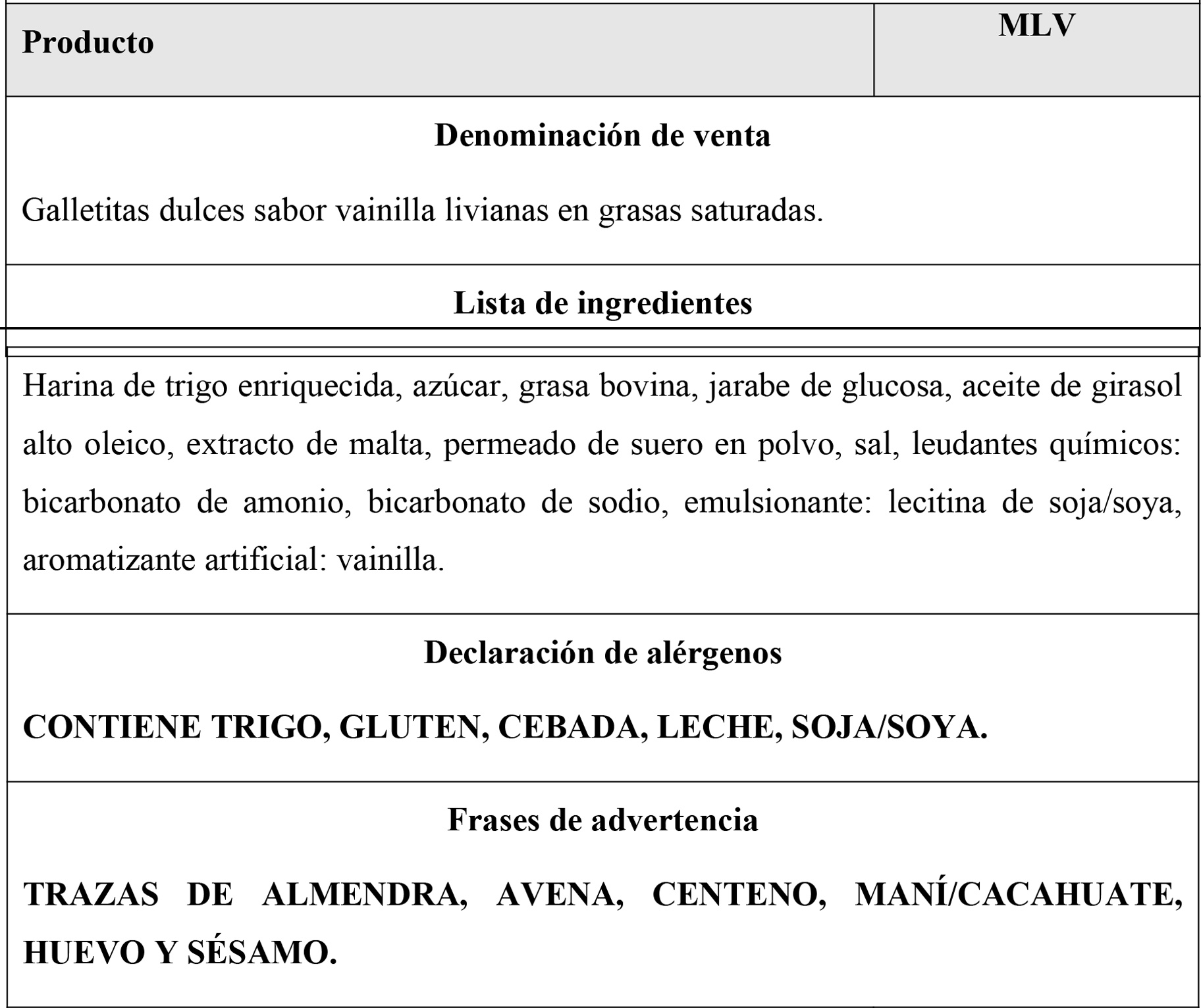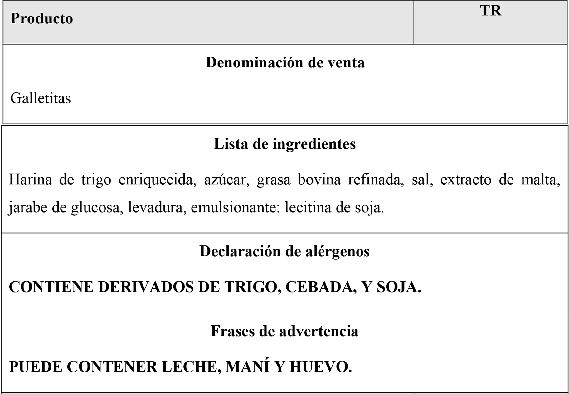 En la tabla N°1 se presenta la información presente en los rótulos del 2019 (denominación de venta, lista de ingredientes y declaración de alérgenos):