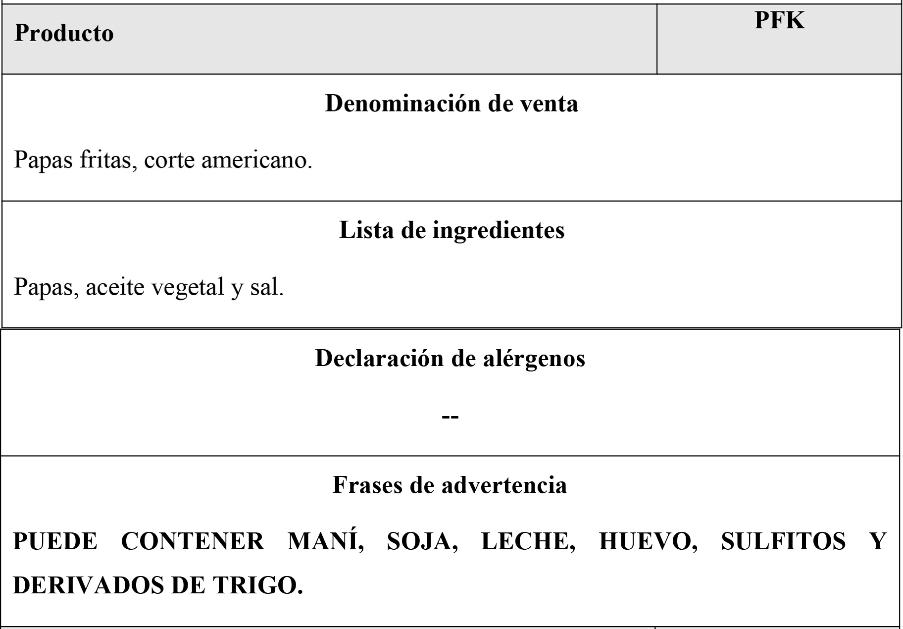 En 15 productos (de un total de 16) se incluían frases de advertencia, lo que corresponde a un 94% del total. Finalmente, los productos MN y PA no utilizan la mayúscula (punto 3.1) y el producto QM no utiliza negrita tal como lo establece el punto 3.2.