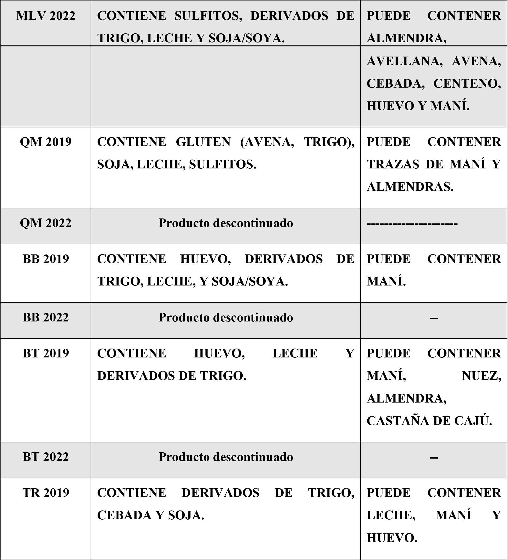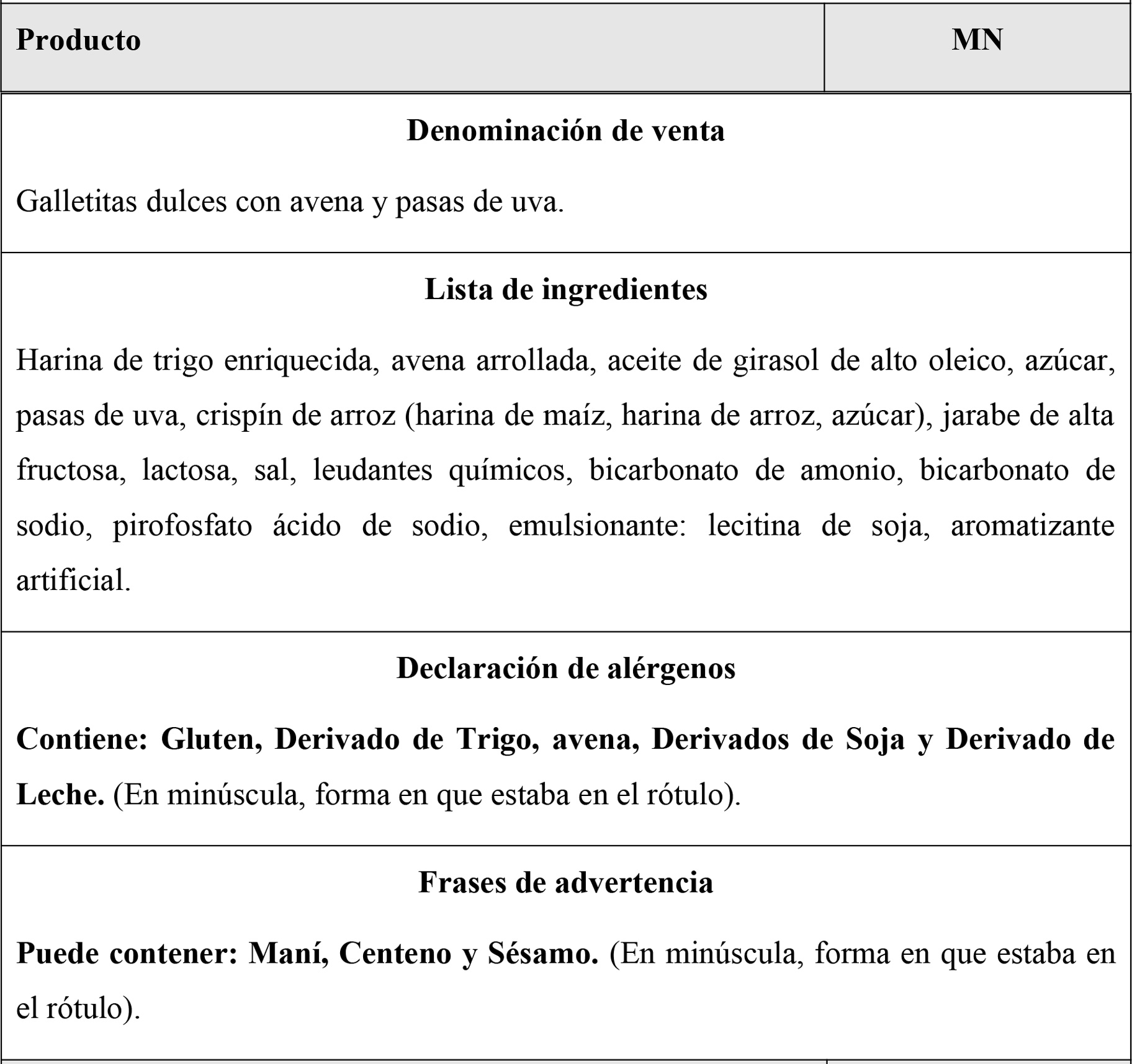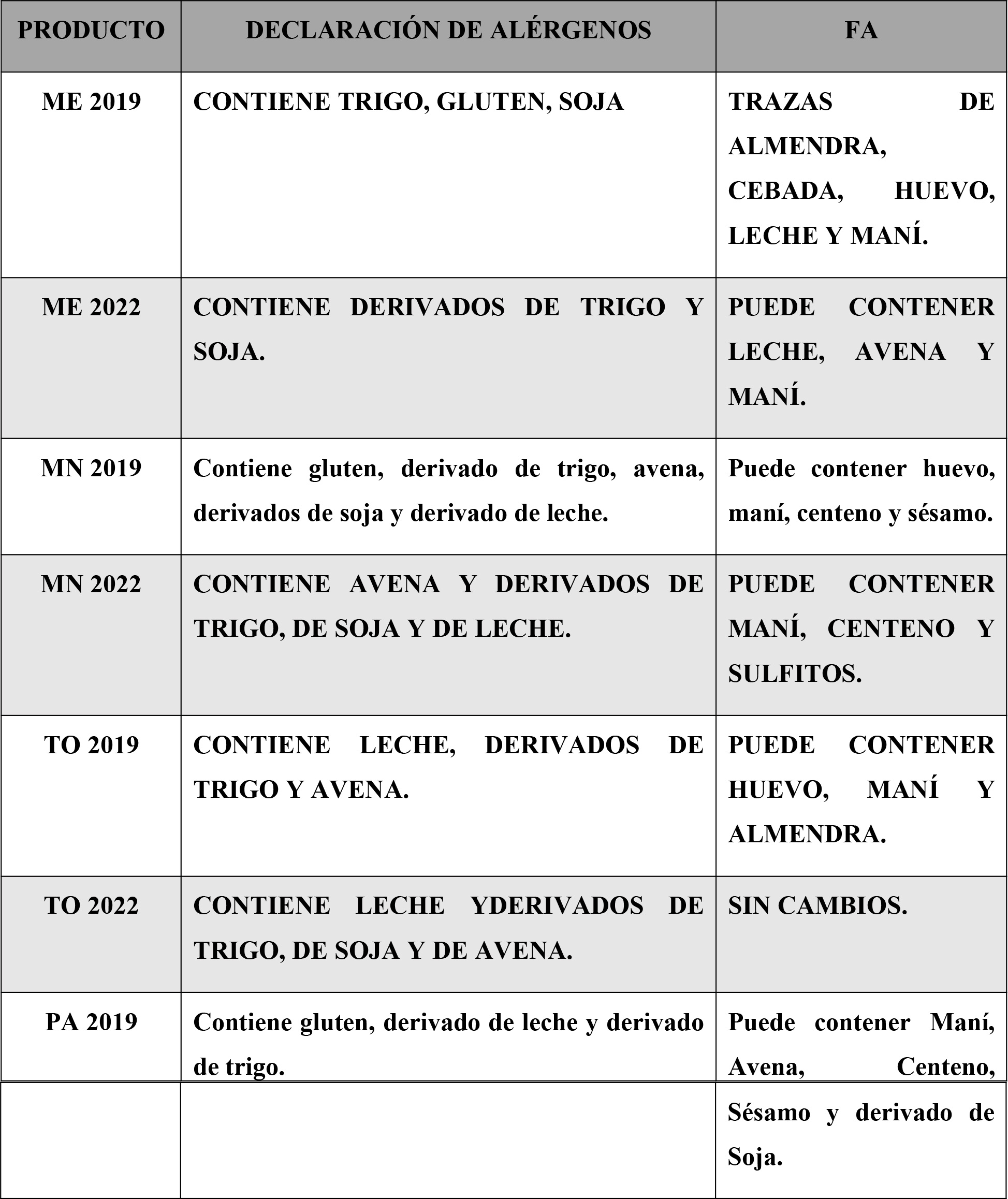 El producto MN no modificó sus ingredientes, pero sí cambió la declaración de alérgenos, eliminando la expresión gluten. Con respecto a la FA, eliminó la inconsistencia normativa de incluir al sésamo y agrega los sulfitos.
