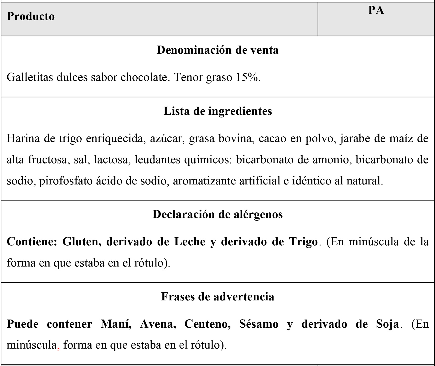 En cuanto al producto PA las inconsistencias observadas persisten tanto en la declaración como en la FA, ya que, en la primera, continúan incluyendo al gluten y en la segunda el sésamo continúa incluido en la FA. En este sentido, un alérgeno no contemplado en la legislación nacional continúa siendo mencionado.