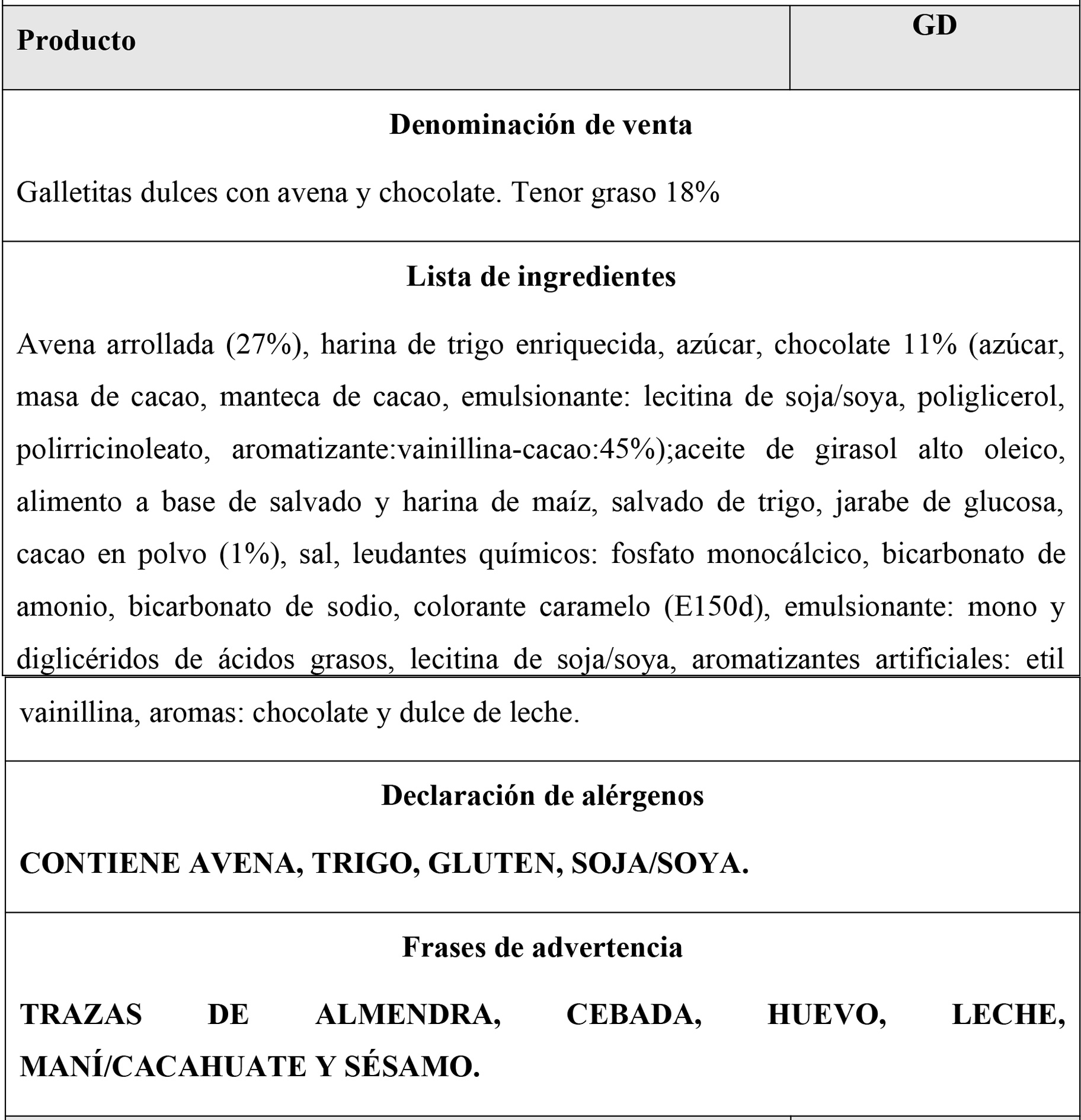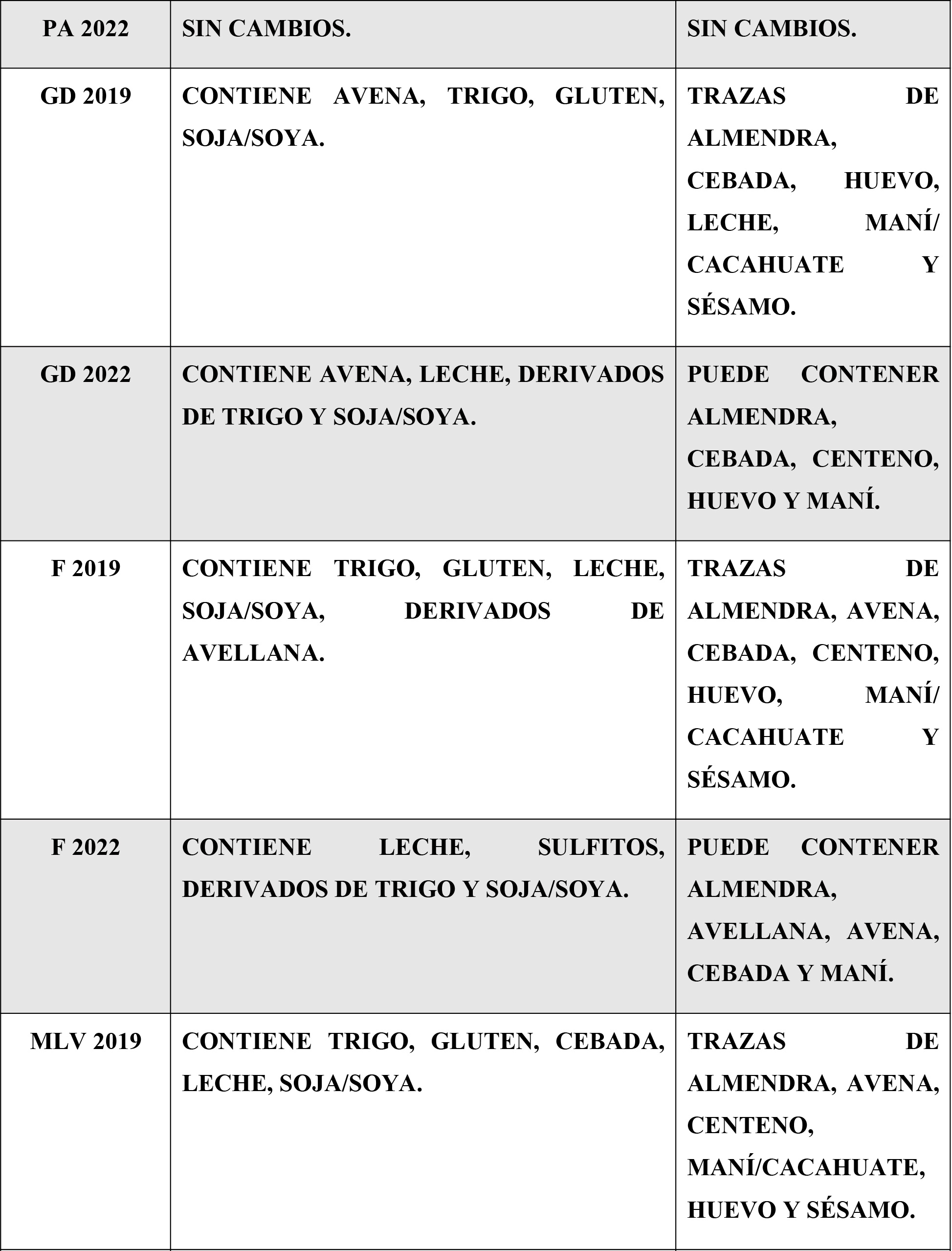 En el producto GD, eliminaron el gluten y agregaron leche. La leche estaba incluida en la FA del producto de 2019. Otro aspecto para considerar es que de la FA eliminaron la expresión "trazas" así como al sésamo, pero incluyeron al centeno entre los alérgenos citados. En síntesis, se eliminaron las inconsistencias observadas.