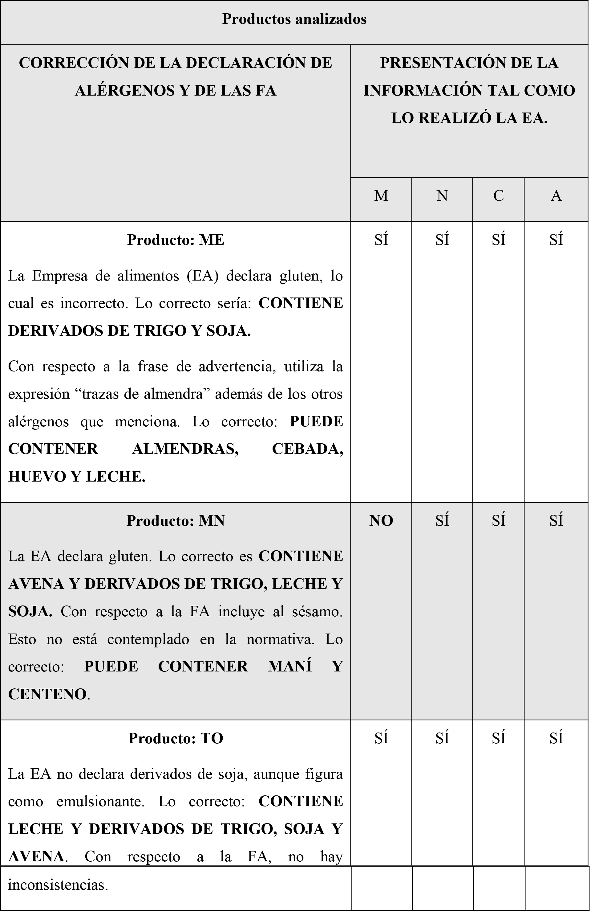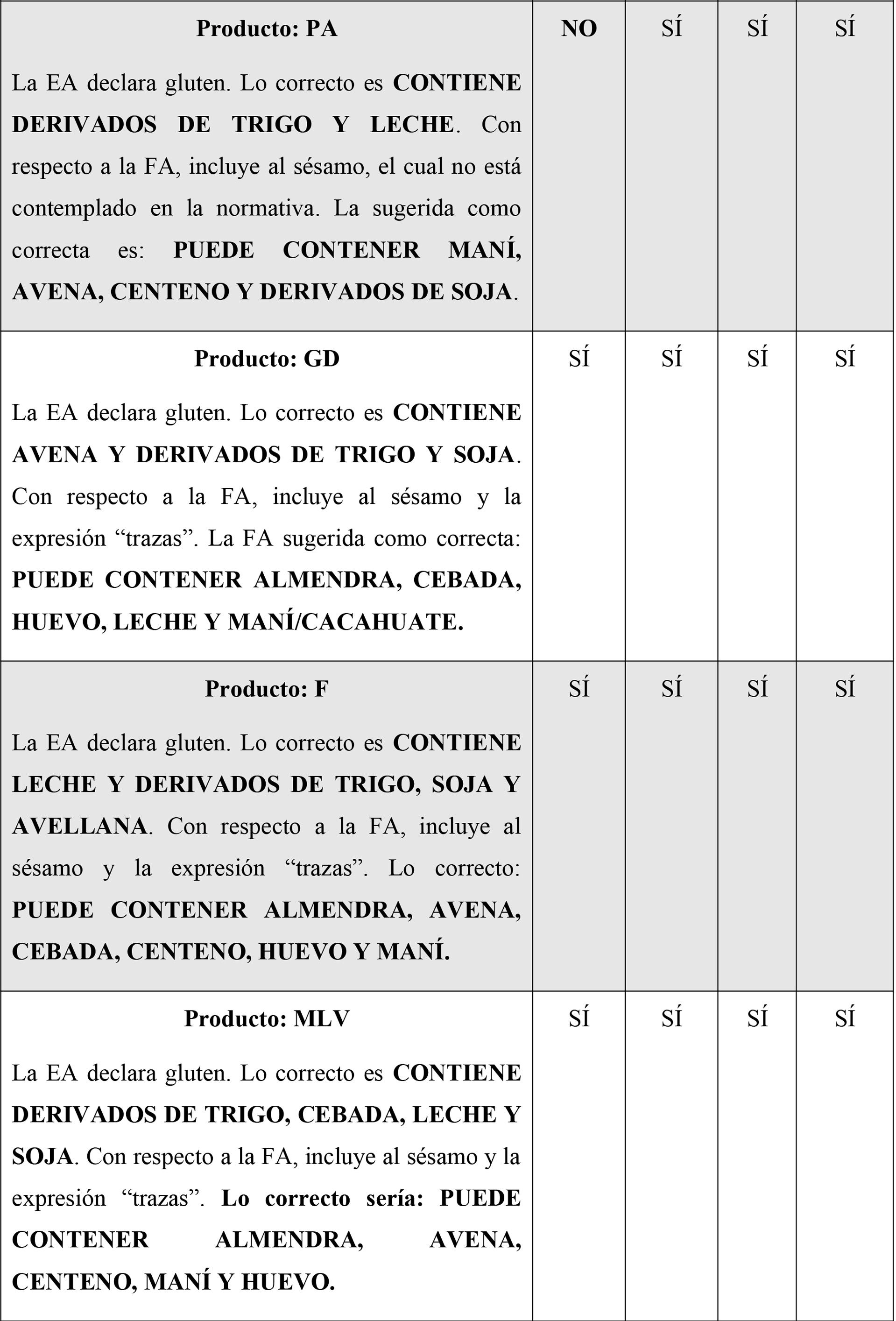 Como resultado del análisis de la declaración de alérgenos y FA presentes en los rótulos en la Tabla 2 se presentan las correcciones que deberían realizarse para subsanar las inconsistencias encontradas, así como el aspecto formal de la presentación de la información tal como la realiza la EA.