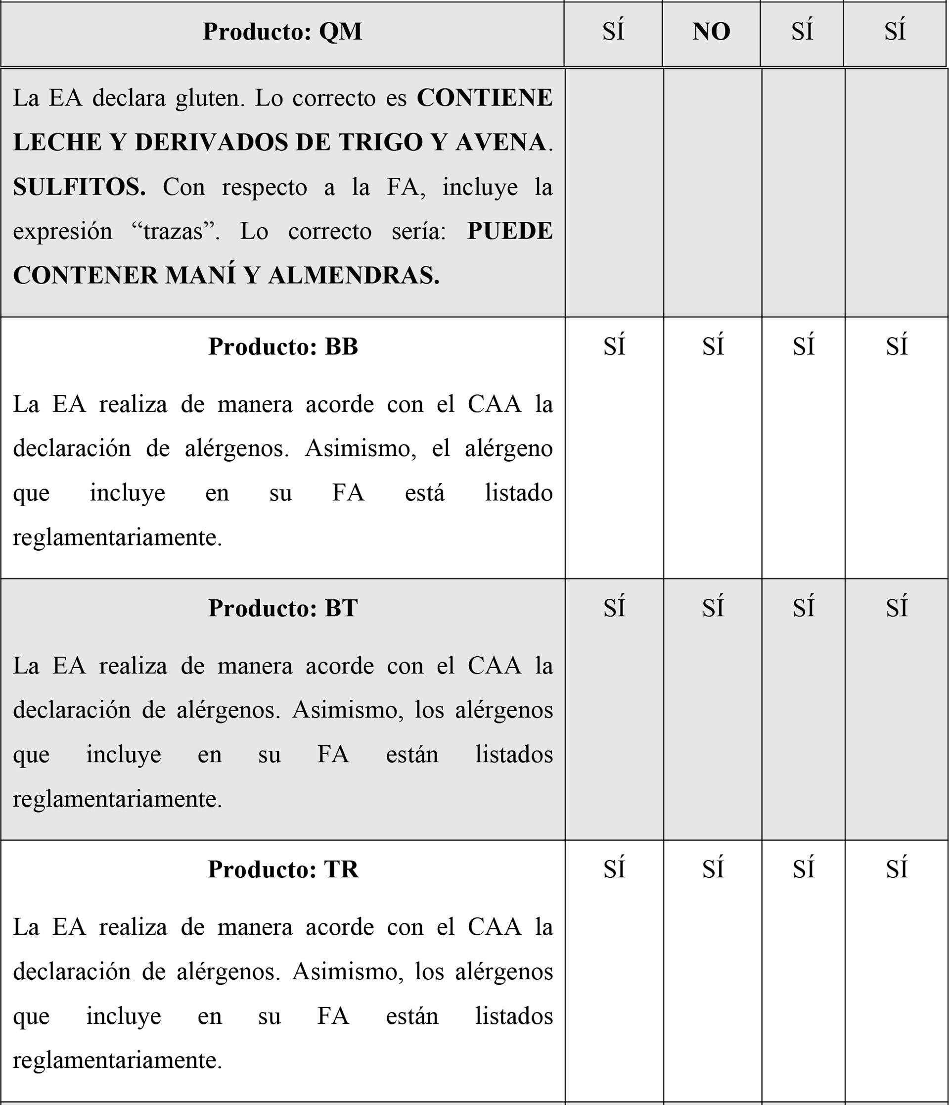 Finalmente, corresponde señalar que las inconsistencias observadas en lo que atañe a la declaración de alérgenos y las frases de advertencia, en relación con la utilización de expresiones no contempladas por la legislación nacional vigente, estuvieron centradas en términos recurrentes como "gluten" o "trazas". De 8 productos que declaraban "contiene gluten" en 2019, 7 productos modificaron este aspecto en 2022. En el caso de la expresión trazas, de 5 productos que la empleaban en 2019, cuatro la suprimieron en 2022. En el quinto restante (QM) no fue posible analizar el requisito, en virtud de que el producto se discontinuó del mercado.