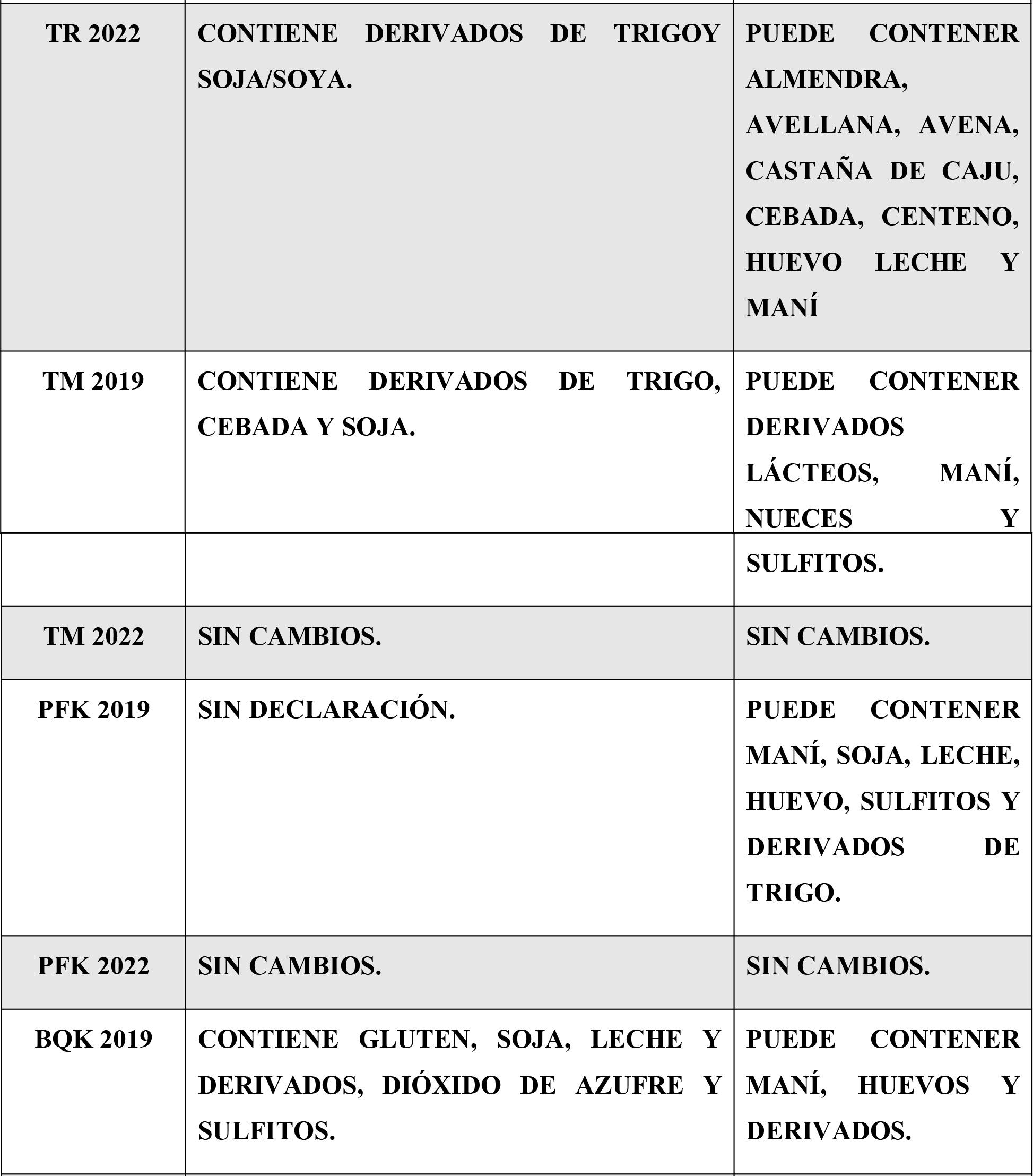 El producto MLV eliminó la expresión gluten y la cebada de la lista de alérgenos, a la misma agregó a los sulfitos. En cuanto a la FA aumentó de 6 a 7 el listado de posibles alérgenos. Sumado a lo anterior, se menciona en su declaración contiene derivados de trigo, leche y soja en lugar de contiene trigo, leche y soja, tal como lo hacía en el 2019. El producto TR, en el período analizado, no presenta irregularidades (solo no incluyeron a la cebada en la lista de alérgenos). De igual modo PFK no presenta inconsistencias. Asimismo, no se modificó su FA. En tanto que TM no presenta modificaciones y continúa con la expresión "derivados lácteos" en su FA.