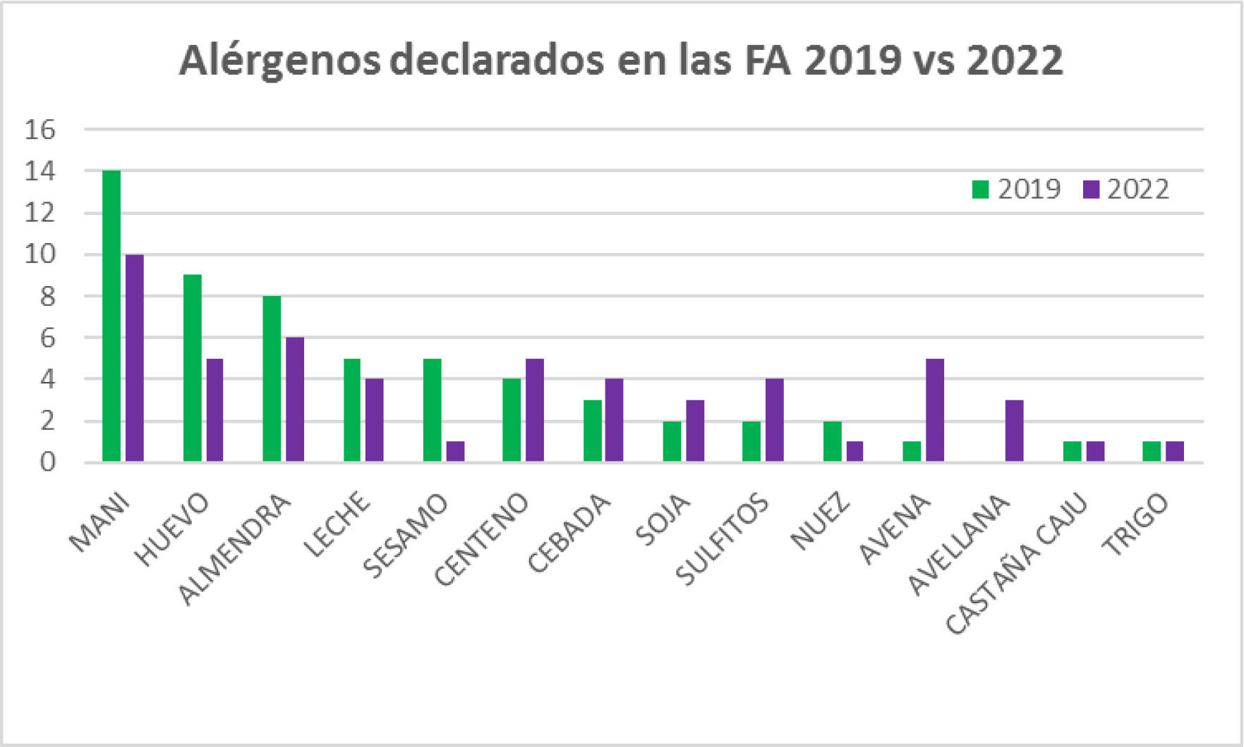 | Figura 4: Alérgenos declarados en la FA de productos elaborados en 2019 vs 2022.