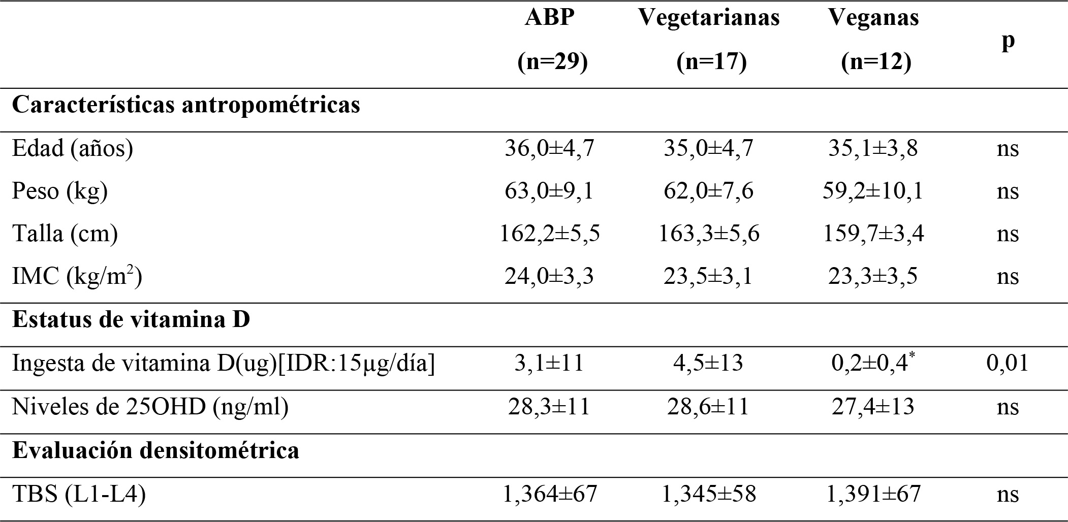 Resultados: Veintinueve mujeres consumidoras de ABP con una edad promedio (X±DS) de 36.0±4 años, con un índice de masa corporal (IMC) de 24.0±4kg/m2 y un tiempo de adherencia a la ABP de 5.6±4 años fueron incluidas en el estudio. La ingesta de vitamina D fue de 3.1±11ug/día en el grupo total [vegetarianas (n=17): 4.5±13ug/día y veganas (n=12):0.2±0.4ug/día (p=0.01)]. En 15 participantes se evaluaron los niveles séricos de 25OHD [28,3±11ng/ml (vegetarianas (n=10): 28,6±10ng/ml y veganas (n=5): 27,4±13ng/ml (9,4-45,9)], siendo estos similares a los exhibidos por el grupo control (20.5±9,6ng/ml). Las participantes con niveles de insuficiencia de vitamina tenían un nivel mayor del trabecular bone score (TBS) (1,383±10) comparado con aquellas con niveles de deficiencia (1,348±97) o suficiencia (1,360±80), sin diferencias estadísticamente significativas.