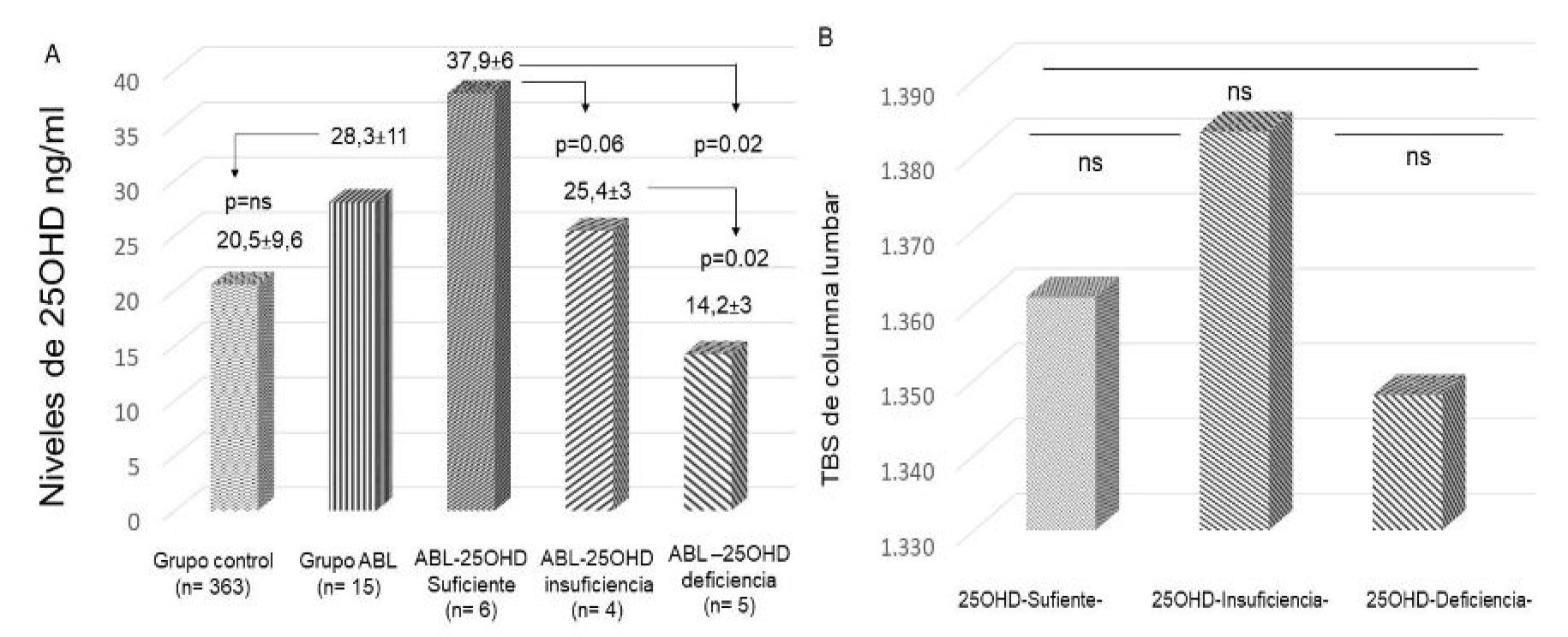 Cuando se analizó el estatus de vitamina D y el TBS aquellas que mostraron niveles de insuficiencia de vitamina D tenían un nivel mayor de TBS (1,383±10), pero sin diferencias estadísticamente significa comparada con aquellas mujeres que exhibían niveles de 25OHD de deficiencia [TBS=1,348±97] o suficiencia [TBS=1,360±80] (figura 1). Por último, no se observó asociación entre niveles de 25OHD con niveles de columna lumbar y TBS [β=0,20,95%IC -2,55-5,05; p=0,48].