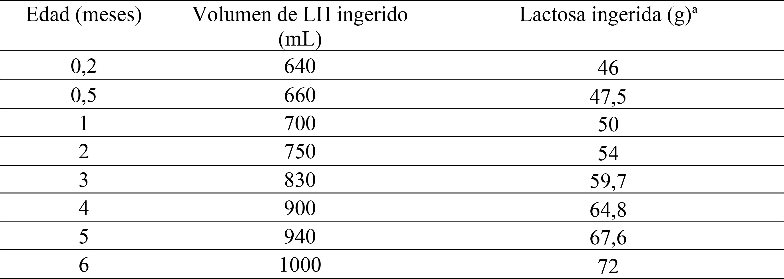 | Tabla 1: Ingesta diaria de lactosa vía leche humana (LH) en los primeros seis meses de vida