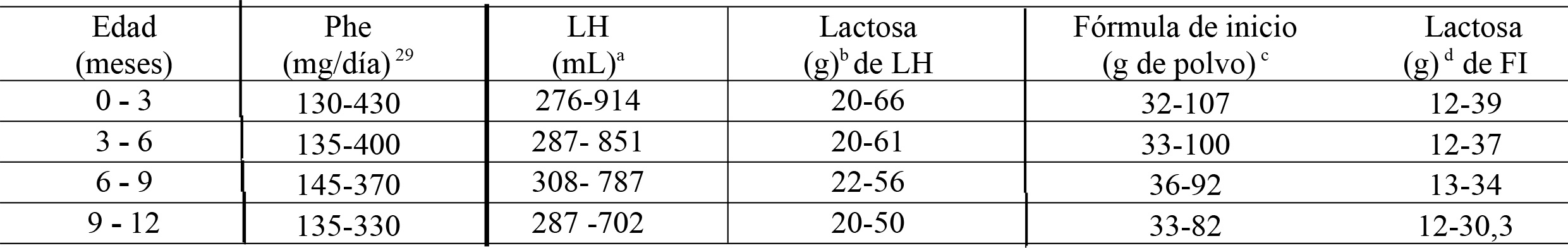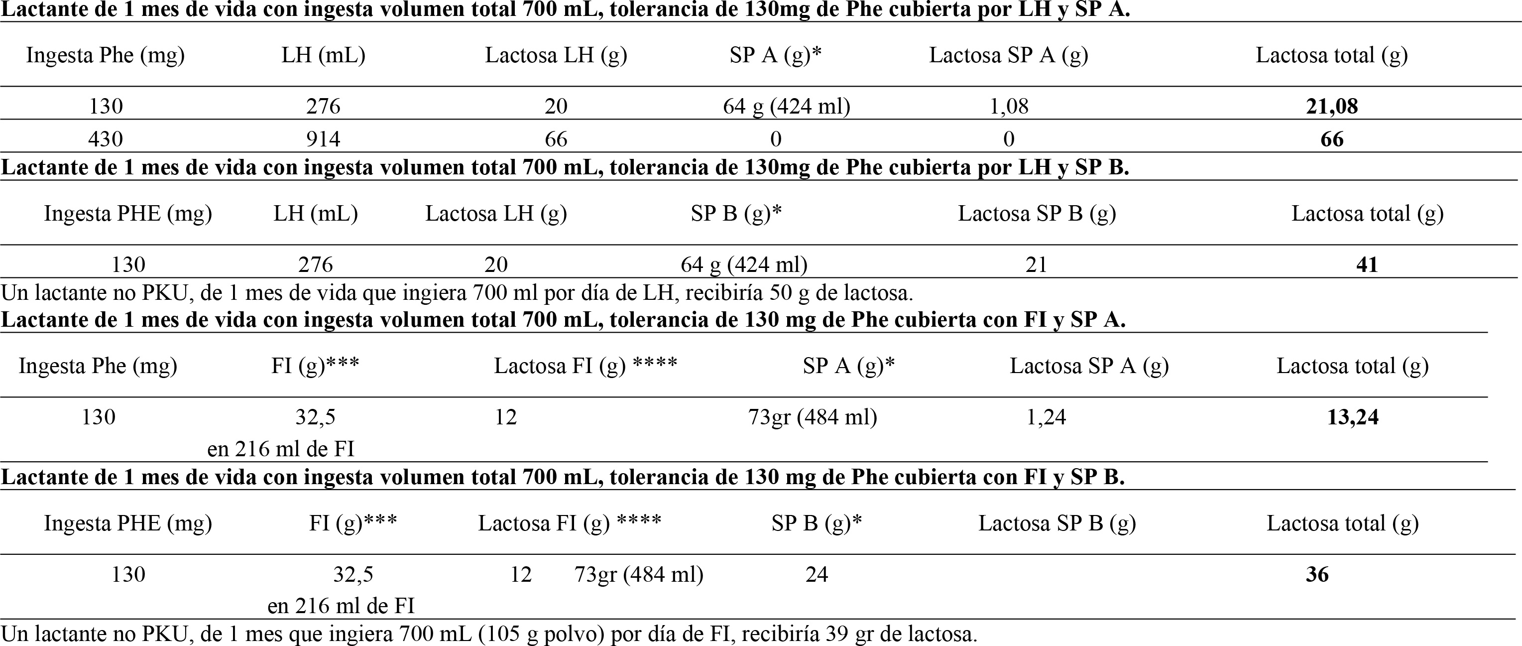Durante el primer año de vida, los lactantes PKU con baja tolerancia a la fenilalanina consumirían menos lactosa que aquellos alimentados exclusivamente con leche humana. Solo a los 30 días, aquellos con alta tolerancia (430 mg Phe) pueden superar esa ingesta (66 g vs. 50 g) (Tabla 3).