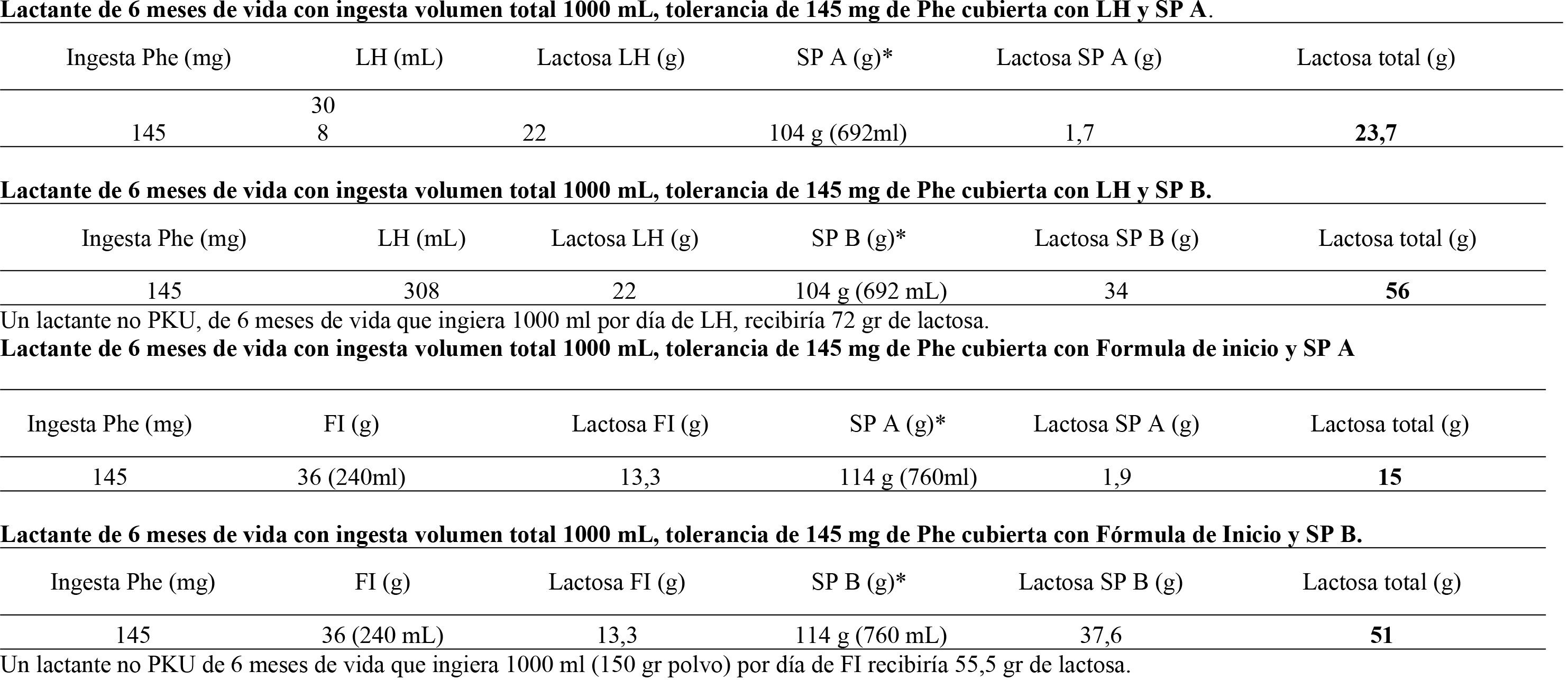 Por ejemplo, un bebé de 1 mes de vida sin PKU consume 50 g de lactosa en 700 mL de leche humana, mientras que un lactante con PKU recibe entre 12 y 41 g. Un bebé de 6 meses sin PKU consume 72 g de lactosa diariamente, mientras que un bebé PKU recibe entre 13 y 56 g de lactosa. En ambos casos, la cantidad ingerida de este disacárido dependerá de la cantidad de leche humana, fórmula de inicio y tipo de sustituto proteico utilizados (Tabla 4).