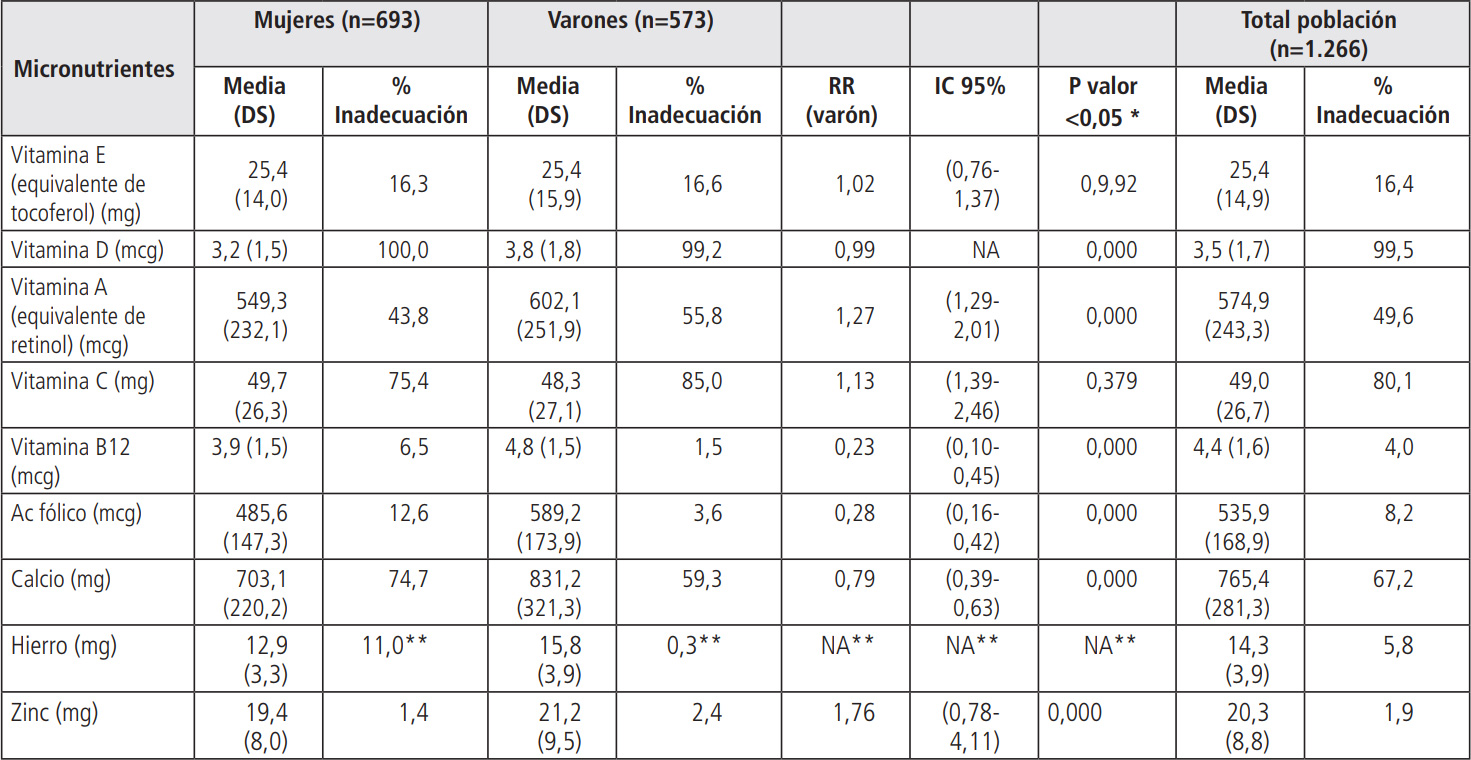 Results: the relative risk (RR) of inadequate intake of calcium, folic acid, and vitamin B12 was higher for women.