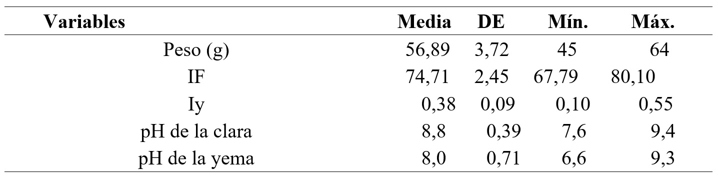 Conclusions: The qualitative and microbiological parameters are acceptable, except the index and pH of the yolk. It is essential to continue ensuring the safety of the egg.
