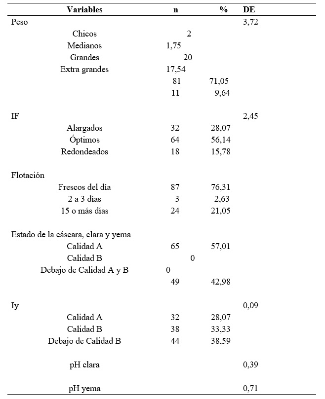 Results: Salmonella spp. wasn´t isolated in none of the samples analyzed. Each unit was clean, although 49 did not present centric yolk, being 57.01 % (n = 65) of A quality, with respect to the shell and content. The average weight was 56.89 g, with a predominance of large eggs, SD ± 3.72. For the shape index, the mean was 74.71, SD ± 2.45, highlighting those with optimal shape. With reference to the flotation test, most were fresh from the day. Regarding the yolk index, the mean was 0.38, SD ± 0.09, with the majority classified below B quality. There was a statistically significant relationship between this last parameter and the state of the shell and content (p = 0.010). The average pH of the white was 8.8, SD ± 0.39 and of the yolk 8.0, SD ± 0.71.