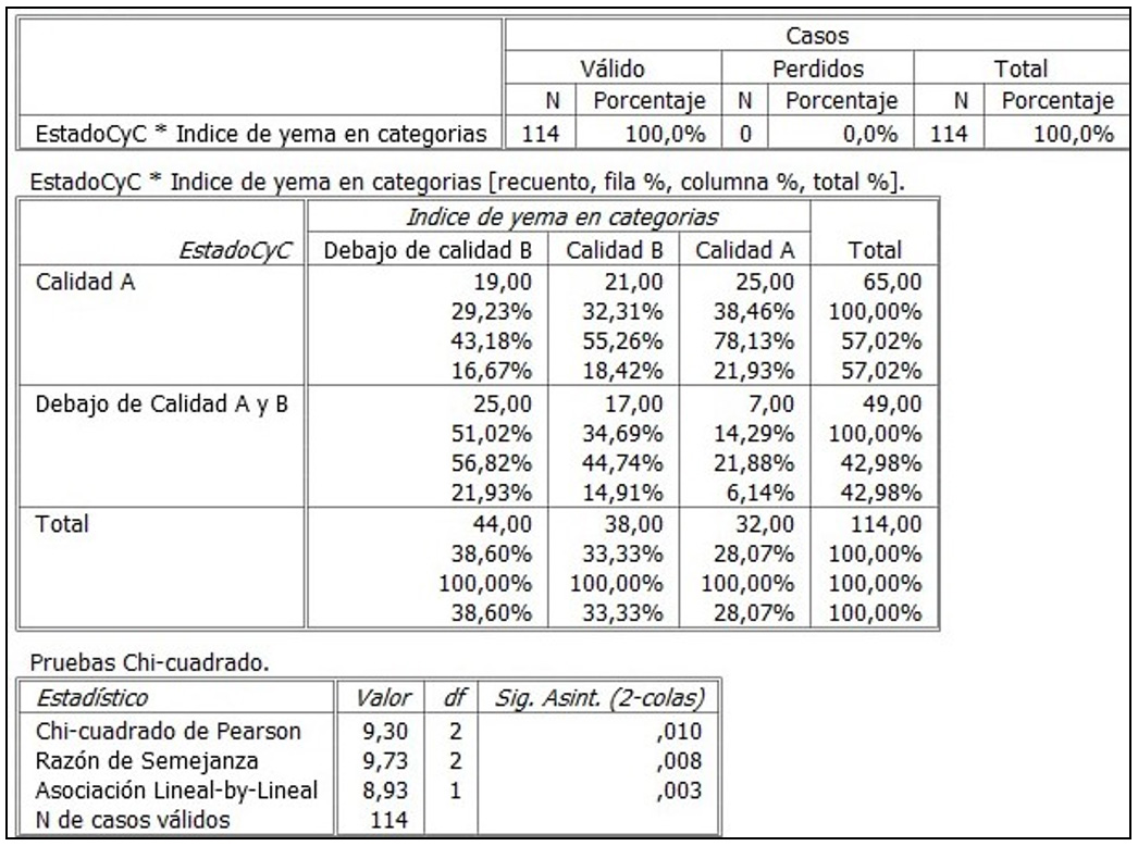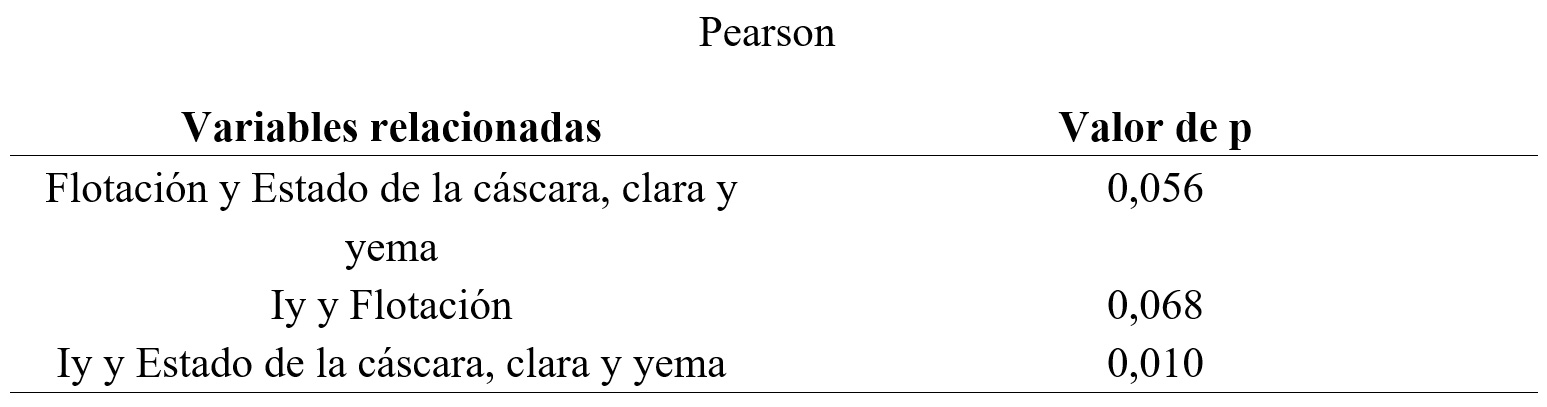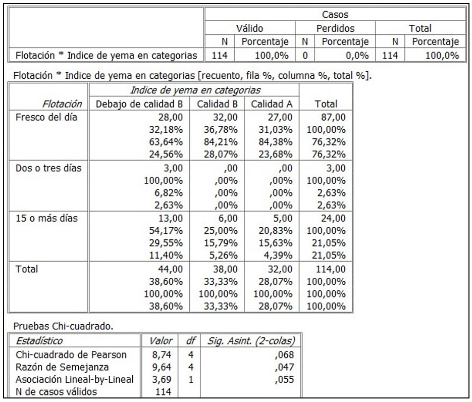 Respecto del estado (cáscara y contenido), la mayoría fueron de calidad A con un 57,01 % (n = 65), clasificándose el resto en calidad B o bajo ambas categorías, y cada unidad estuvo limpia, sin suciedad o roturas, con clara firme, aunque 49 presentaron yema no céntrica. La prueba de Chi cuadrado utilizada demostró que no hubo relación estadísticamente significativa entre el estado (cáscara y contenido) y la flotación (p = 0,056), como así también entre la flotación y el Iy (p = 0,068), aunque sí hubo relación estadísticamente significativa entre el estado (cáscara y contenido) y el Iy (p = 0,010). La media del Iy fue 0,38, DE ± 0,09, clasificándose mayormente debajo de calidad B con un 38,59 % (n = 44), el resto se clasificó en calidad A o B; pH de clara, su media fue de 8,8, DE ± 0,39, y yema 8,0, DE ± 0,71.