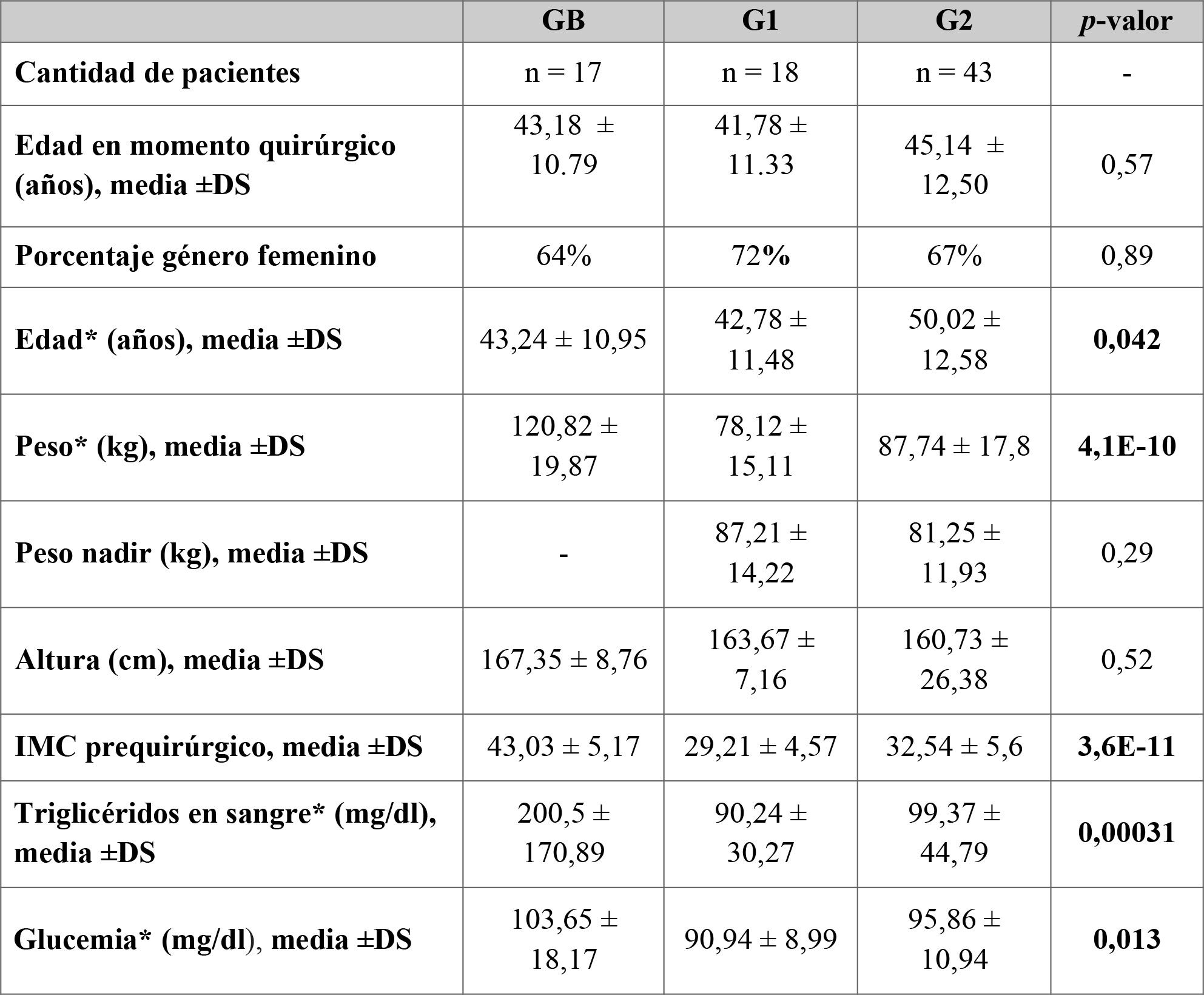 La media de la edad de los individuos fue mayor en el grupo G2, lo cual es de esperar considerando que los pacientes de este grupo son aquellos cuya intervención quirúrgica ocurrió hace más tiempo. Por otro lado, se observó una disminución significativa del índice de masa corporal (IMC) en el grupo G1 al comparar con pacientes del grupo GB (Tablas 1 y 2).