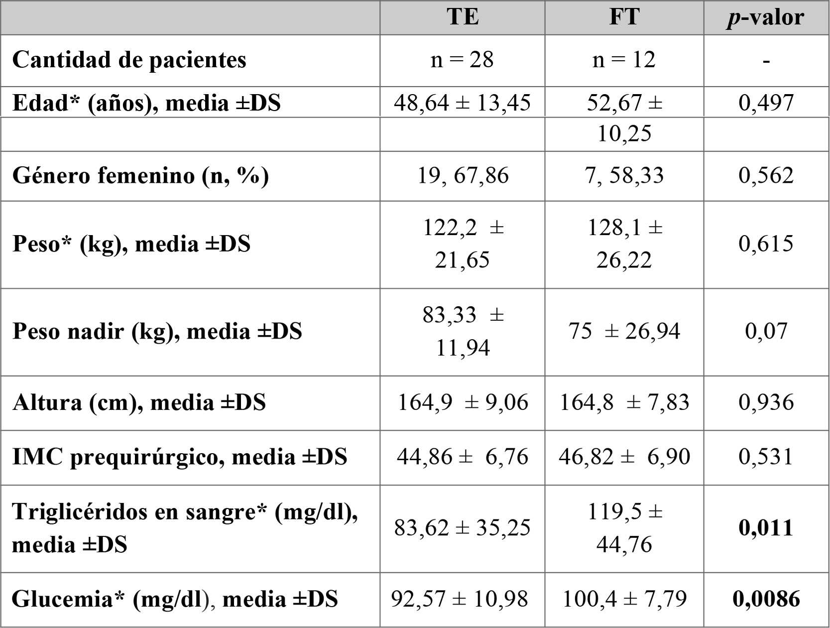 Tabla 2: Características de los subgrupos TE y FT