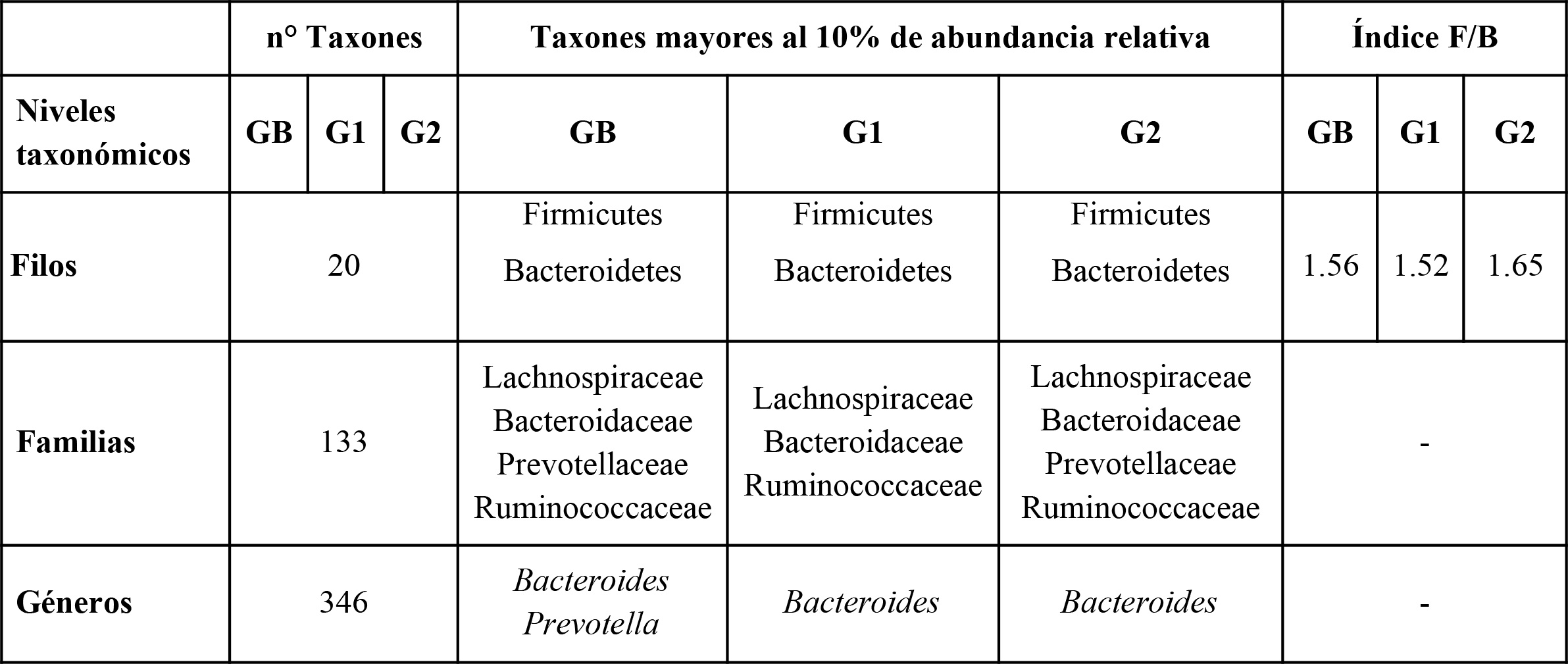 Se identificó un total de 768 OTUs clasificadas a nivel género en todas las muestras, de las cuales 489 estaban presentes en el grupo GB, 633 en el grupo G1, y 607 en el G2. Se cuantificaron los taxones para cada nivel taxonómico (filo, familia, género), siendo Firmicutes y Bacteroidetes los filos dominantes en todos los casos (abundancia relativa mayor al 10%). A nivel familia, las bacterias pertenecientes a Lachnospiraceae, Bacteroidaceae, Prevotellaceae y Ruminococcaceae se encontraron entre los taxones dominantes en todos los grupos, con la excepción de Prevotellaceae, cuya abundancia fue del 6,56% en G1 (Tabla 3).