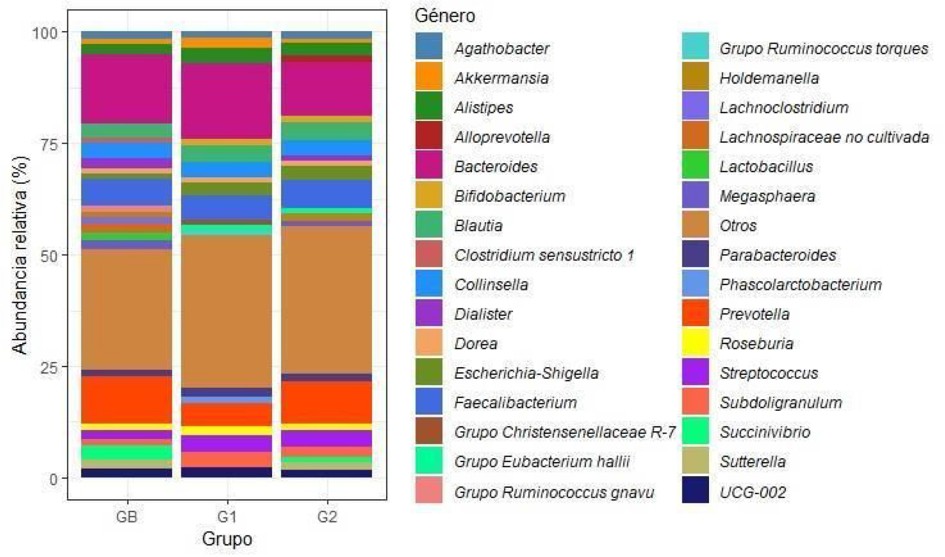 Por otro lado, los miembros del género Bacteroides presentaron dominancia en todos los grupos, mientras que Prevotella también presentó una abundancia relativa elevada en GB. La composición de las comunidades bacterianas de cada grupo a nivel de género se muestra en la Fig. 1.
