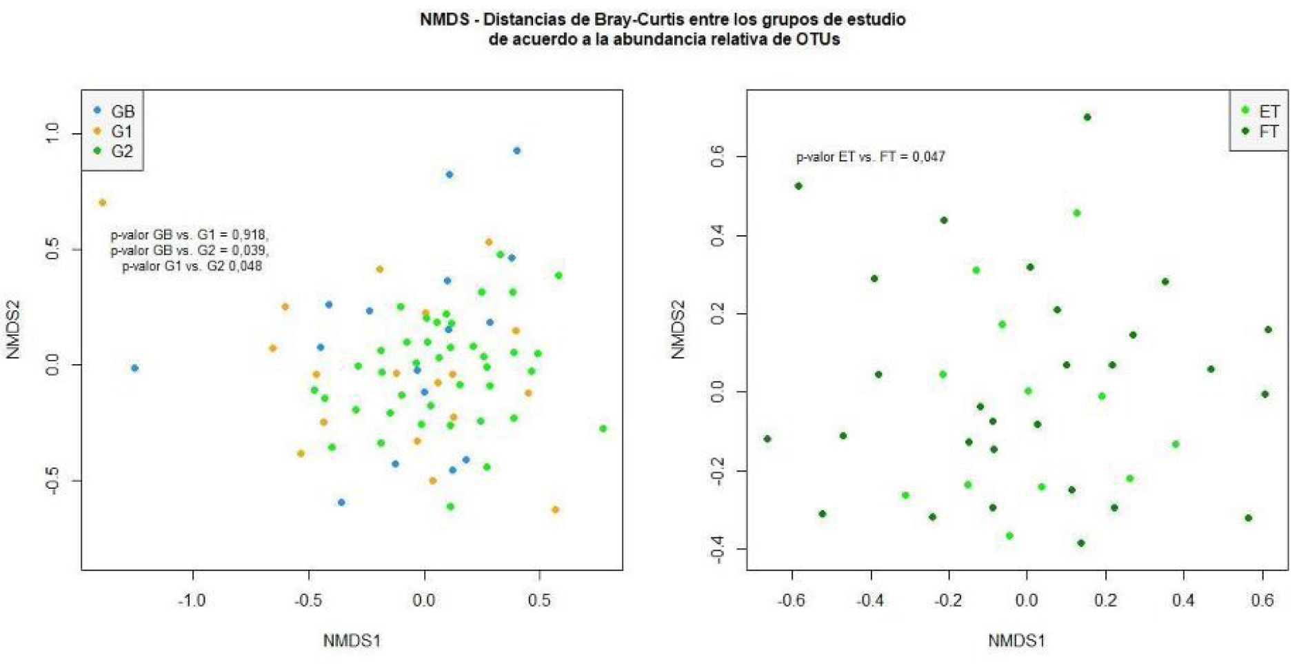 Por último, el análisis de la diversidad beta de los OTUs bacterianos basado en el índice de disimilitud de Bray-Curtis, el cual considera las abundancias relativas, reveló una separación estadísticamente significativa entre las muestras del grupo G2 al comparar tanto con GB (p = 0,039) como con G1 (p = 0,048), así como también ocurrió al comparar al grupo TE con el grupo FT (p = 0,047) (Fig. 3). En cambio, al realizar el mismo análisis basándose en el índice de Sørensen, que solo toma el dato de presencia-ausencia de los OTUs, no se observaron diferencias significativas en ninguno de los casos.