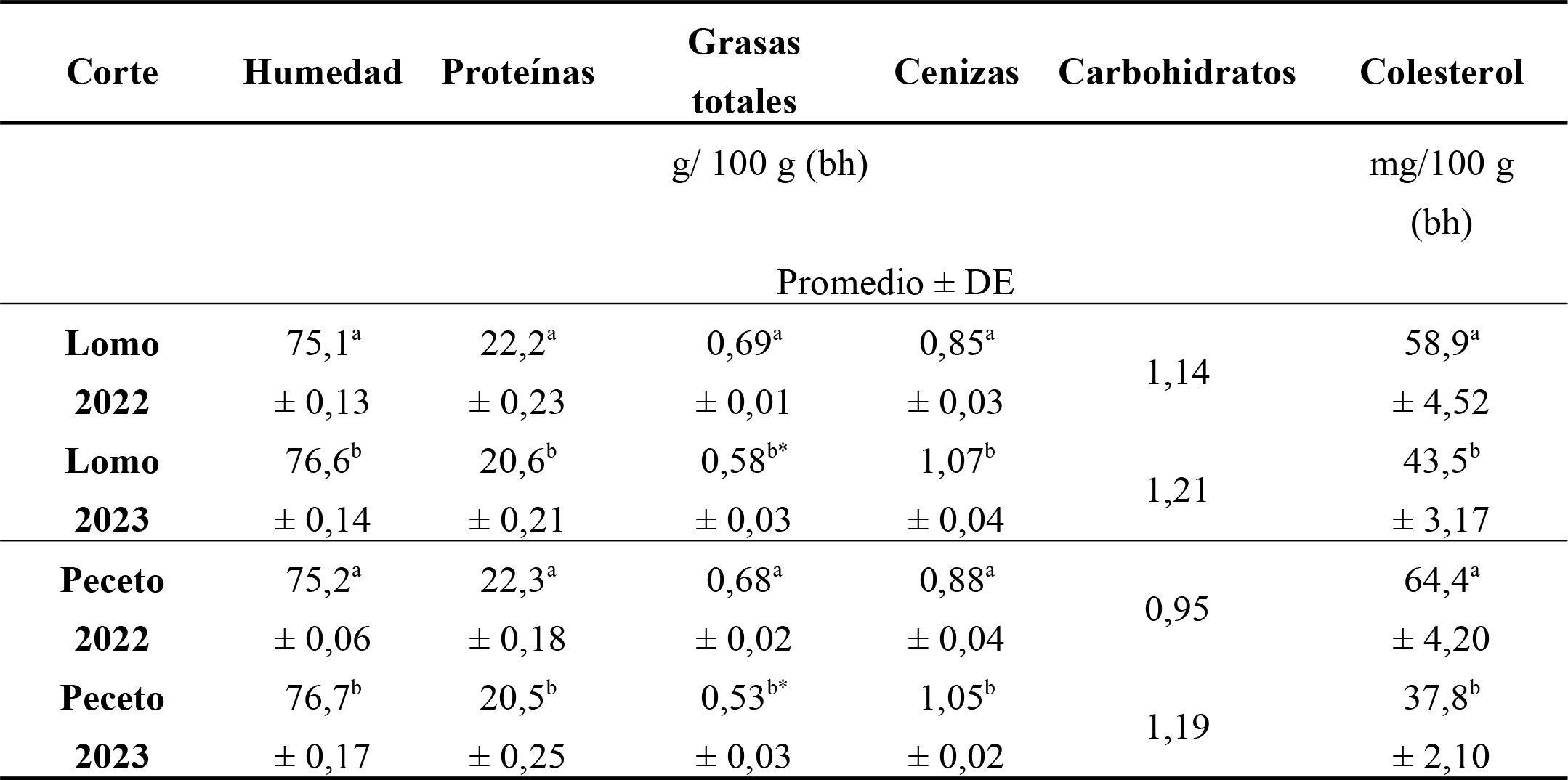 | Tabla 1: Comparación de la composición centesimal y el contenido de colesterol de los cortes lomo y peceto de los años 2022 y 2023, expresada en base húmeda (n = 10).