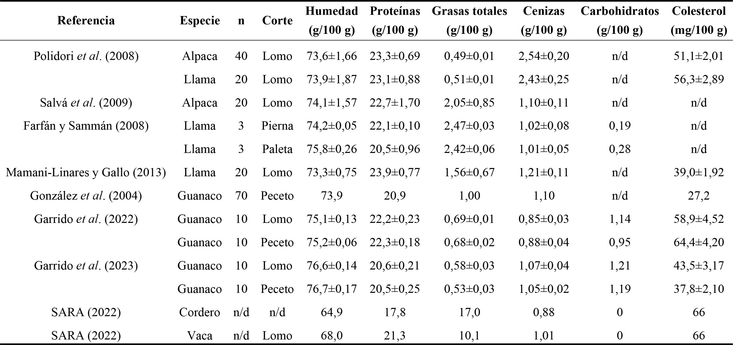 Se encuentra amplia información bibliográfica sobre los aspectos nutricionales de la carne de llama y alpaca. En tal sentido, como se observa en la Tabla 2, se describen resultados de trabajos realizados con llamas alimentadas con pasturas naturales en la provincia de Jujuy14 y con animales criados de forma extensiva en Perú y Chile13,15,16. En el caso del guanaco, solo se encuentra información relacionada a los componentes mayoritarios de la carne en un estudio realizado en el sur de Chile17.