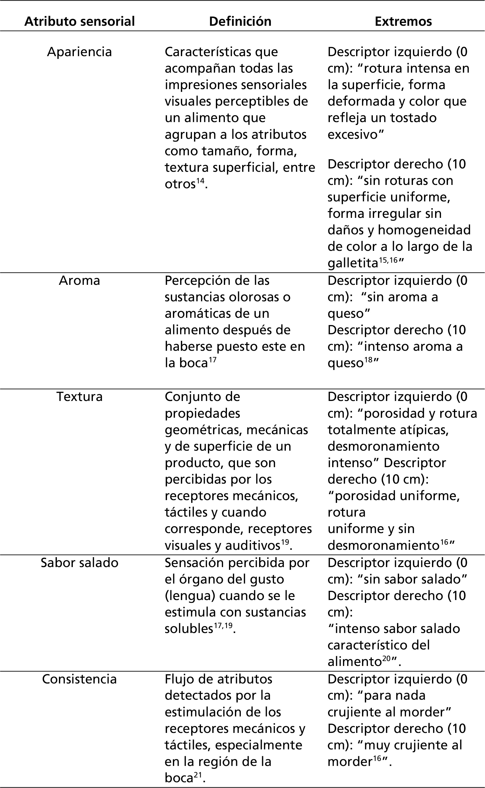 La evaluación sensorial se realizó mediante una prueba de tipo descriptiva en panel semientrenado, conformado por 6 evaluadores (40±4 años), un 16,7% de género masculino y un 83,3% femenino. Estos fueron reclutados del staff de investigadores de la Universidad Tecnológica Nacional y Universidad Nacional de Rosario, utilizando el Análisis Descriptivo Cuantitativo (QDA). Las sesiones de entrenamiento fueron realizadas durante los meses de junio y julio de 2023, a partir de las cuales se obtuvo un consenso sobre los atributos sensoriales para caracterizar las galletitas. Se consideraron las variables apariencia, aroma, textura, sabor salado, consistencia y aceptabilidad global (Tabla 1). Esta prueba se realizó en cabinas individuales, con luz y temperatura adecuada entregando las muestras (5 g) codificadas de forma aleatoria. Los panelistas valoraron por duplicado cada uno de los atributos sensoriales sobre una escala gráfica graduada de 10 cm de longitud, anclada en los bordes.