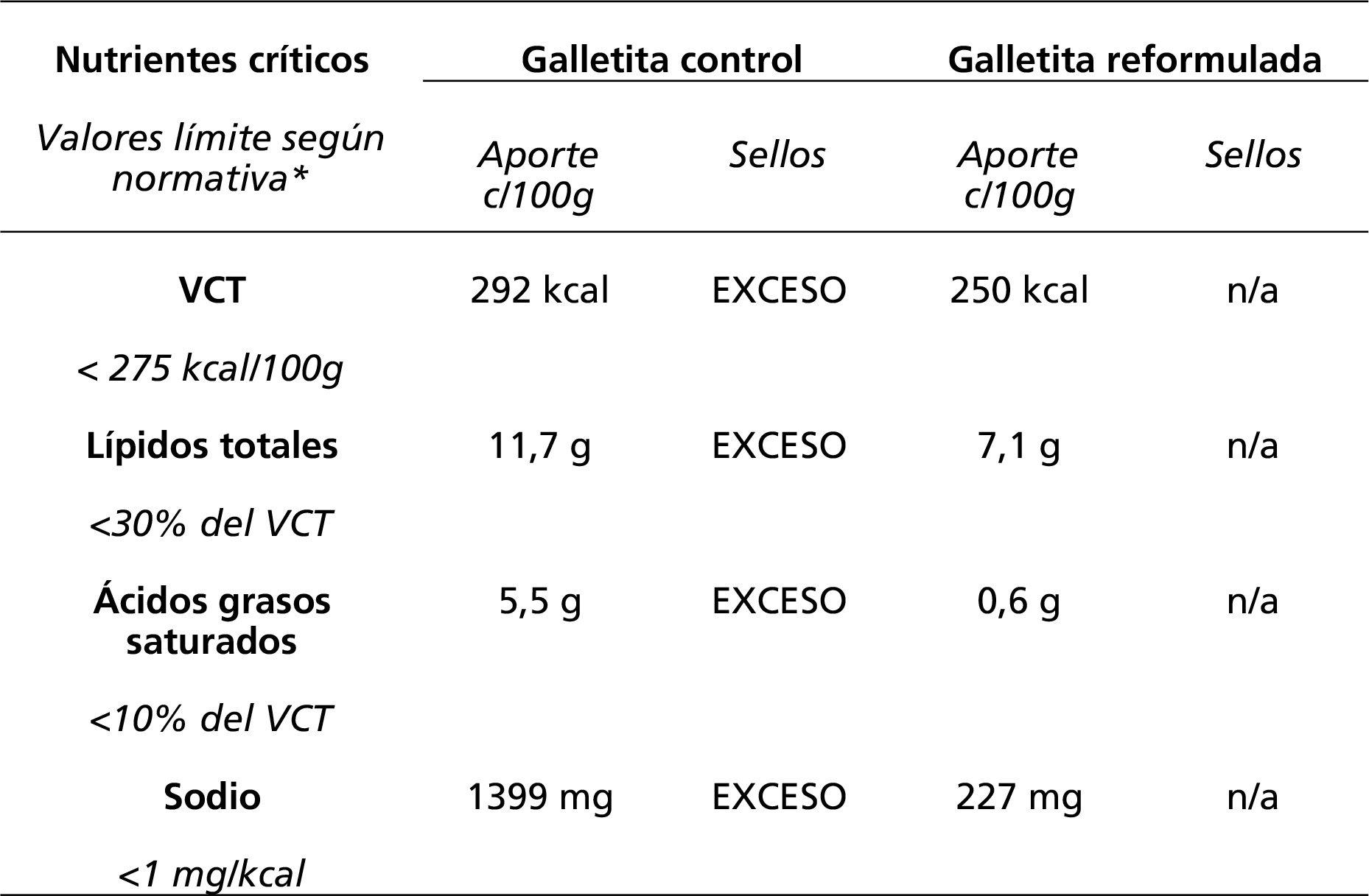 En la Tabla 2 se muestran los valores de nutrientes críticos según la Ley Nº 27642 con sus respectivos puntos de corte. Tras la reformulación de la galletita se obtuvo una reducción del 40% y del 90% para lípidos totales y ácidos grasos saturados, respectivamente; así como también una disminución del contenido de sodio del 83%, respecto de la galletita control. Estas modificaciones implicaron la desaparición de los correspondientes sellos de exceso. Además, con la incorporación de la harina integral en la formulación el aporte de fibra dietética se incrementó de 0,2 g a 4,68 g cada 100 g de producto.