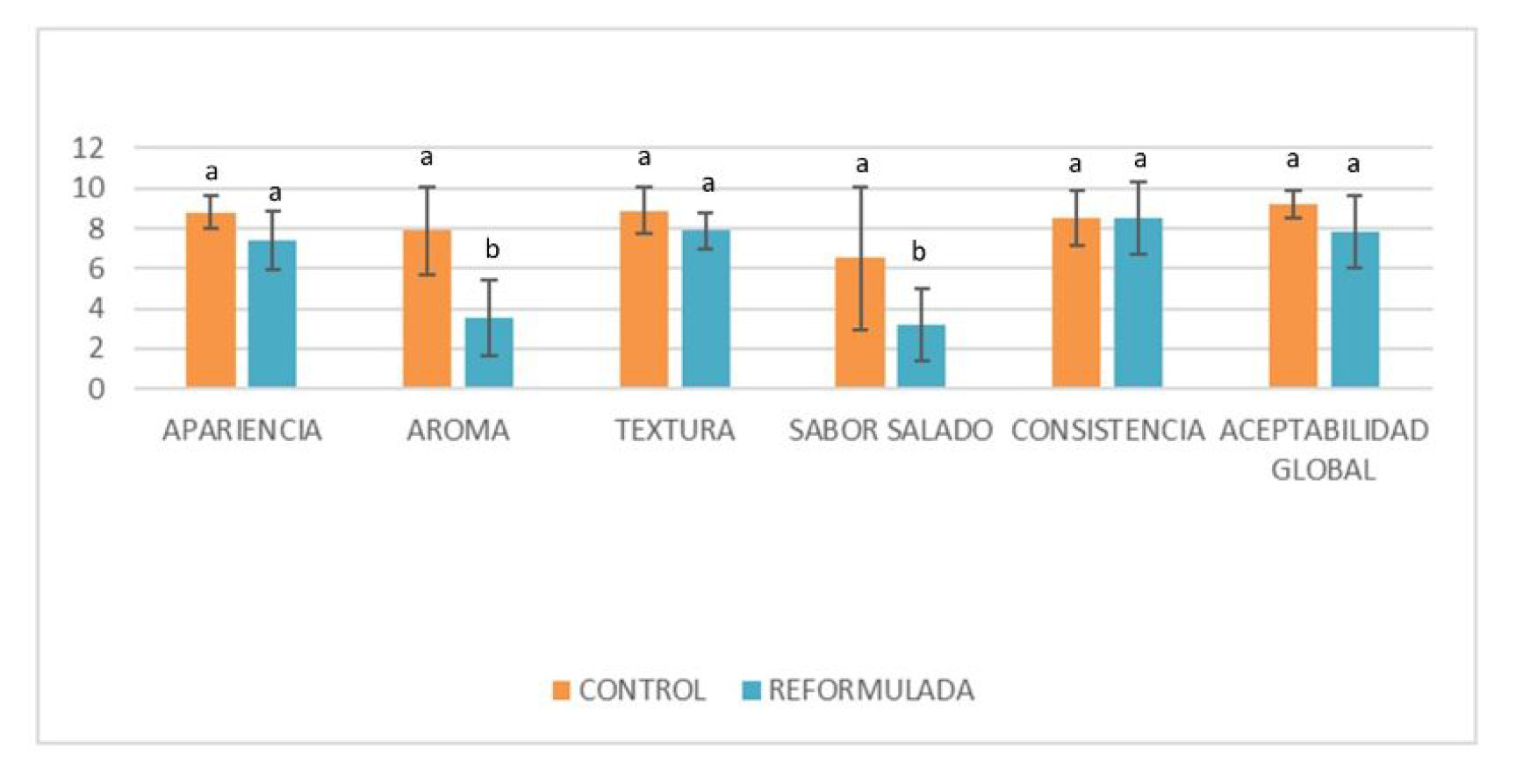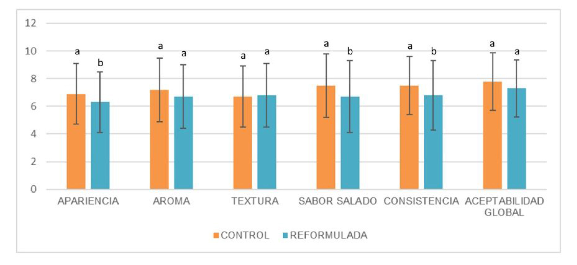 | Letras diferentes indican diferencias significativas (p<0,05) entre galletita control y reformulada. Apariencia (p=0,085), aroma (p=0,040), textura (p=0,143), sabor salado (p=0,036), consistencia (p=0,980) y aceptabilidad global (p=0,126). |