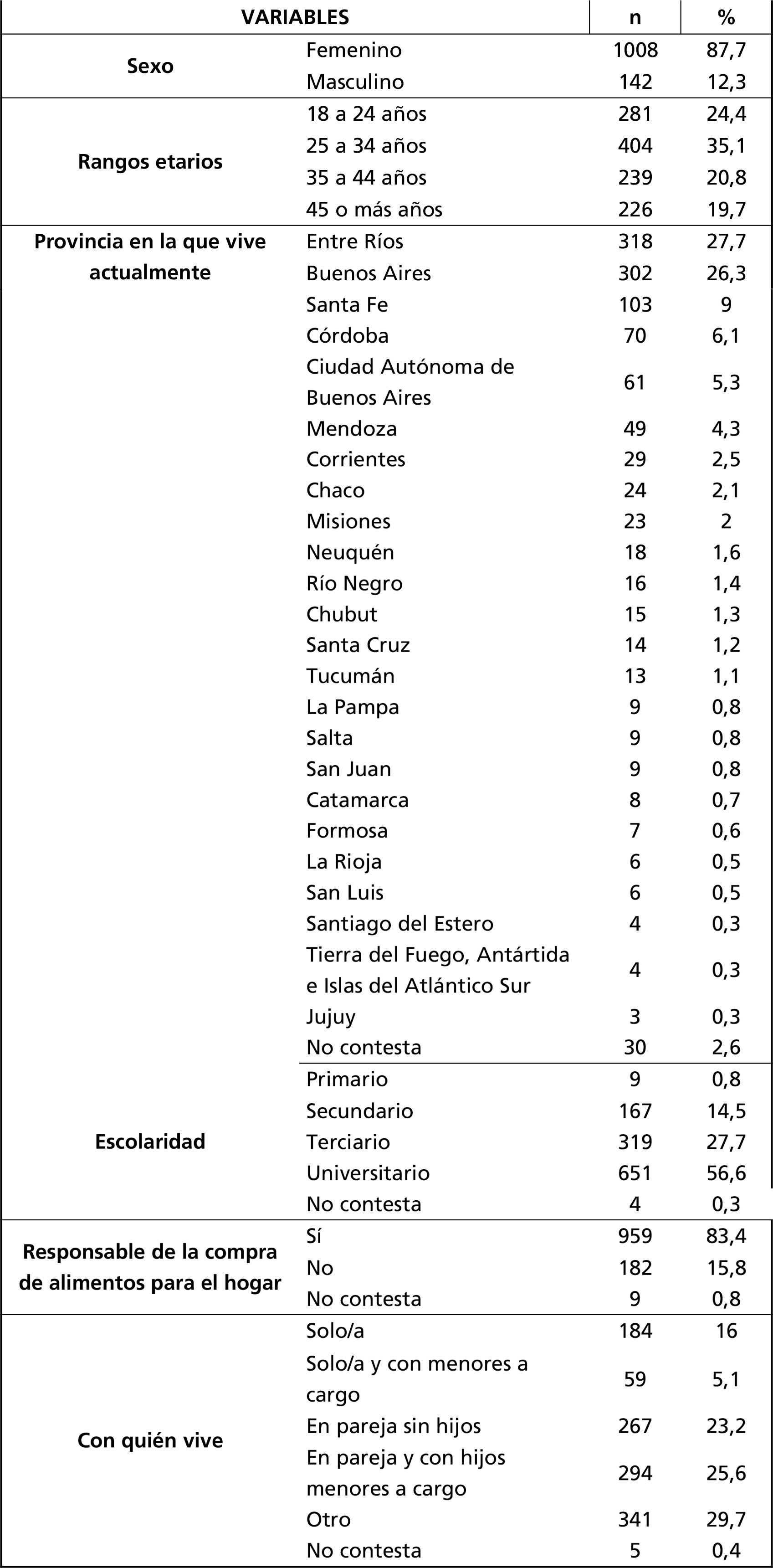 En este estudio participaron un total de 1150 personas, de las cuales el 87,7 % eran de sexo femenino. El rango etario más representado abarcó a personas de 25 a 34 años. Se logró la representación de todas las provincias, destacándose Entre Ríos, Buenos Aires y Santa Fe como las más predominantes. Un 56,6 % de los participantes informó tener educación universitaria. Además, el 83,4 % se consideró responsable de la compra de alimentos para el hogar (Tabla 1).