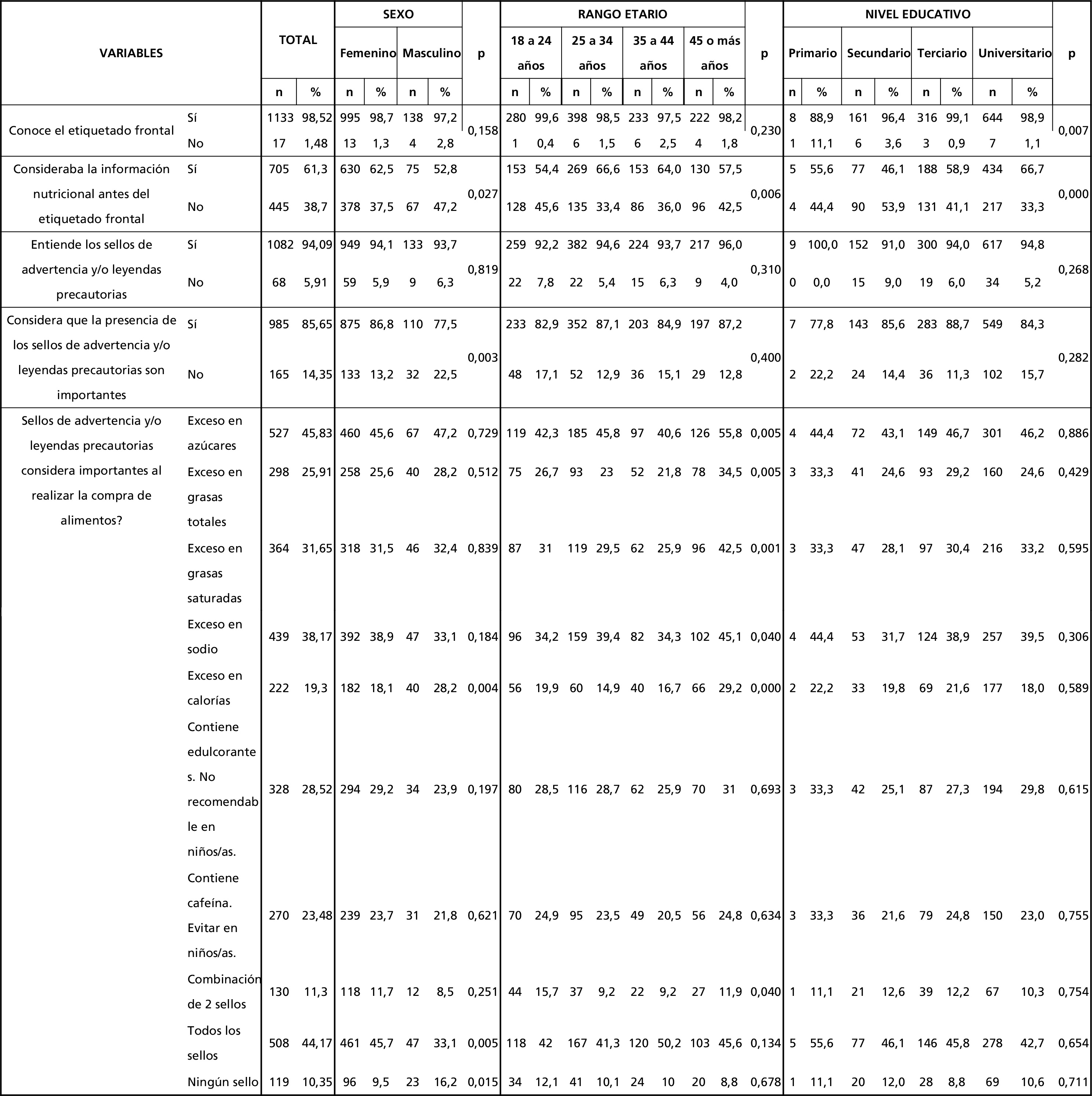 Se encontraron asociaciones estadísticamente significativas para la prueba de Chi-cuadrado de Pearson en varios casos en cuanto a la percepción del etiquetado frontal según sexo, rango etario y nivel educativo. Aquellos con nivel universitario fueron quienes más indicaron conocer el etiquetado frontal (p=0,007), mientras que las personas de 25 a 34 años eran las que más consideraban la información nutricional antes del etiquetado frontal (p=0,006), como también, aquellos con nivel universitario (p<0,001). Las mujeres eran las que más consideraban que la presencia de los sellos de advertencia y leyendas precautorias eran importantes (p=0,003).