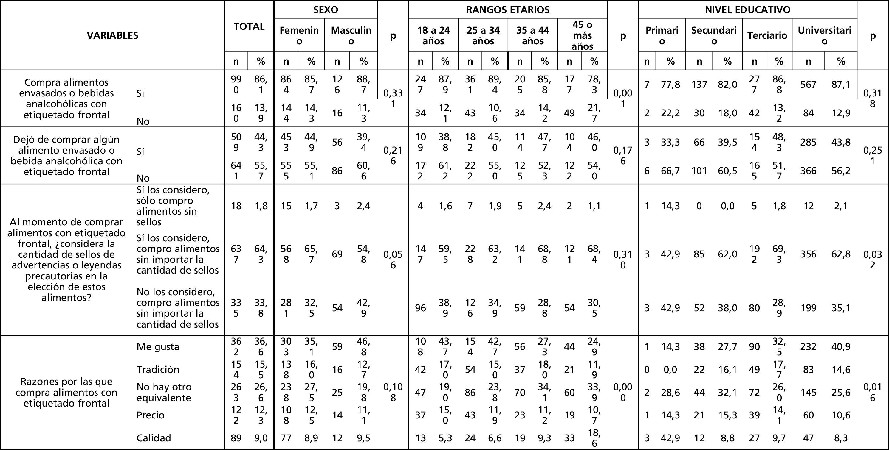 Respecto de describir los patrones de compra según sexo, rango etario y nivel educativo, se encontraron las siguientes asociaciones estadísticamente significativas mediante la prueba de Chi-cuadrado de Pearson; las personas de 25 a 34 años eran las que más compraban alimentos con etiquetado frontal (p=0,001), mientras que aquellos con nivel universitario eran los que más tenían en cuenta los sellos de advertencia y compraban alimentos con menos sellos de advertencia (p=0,032). Además, aquellas personas de 25 a 34 años y con nivel universitario eran los que más mencionaban que las principales razones para comprar alimentos con etiquetado frontal eran que les gustaba, la falta de alternativas y la tradición (p<0,001 y p=0,016, respectivamente).