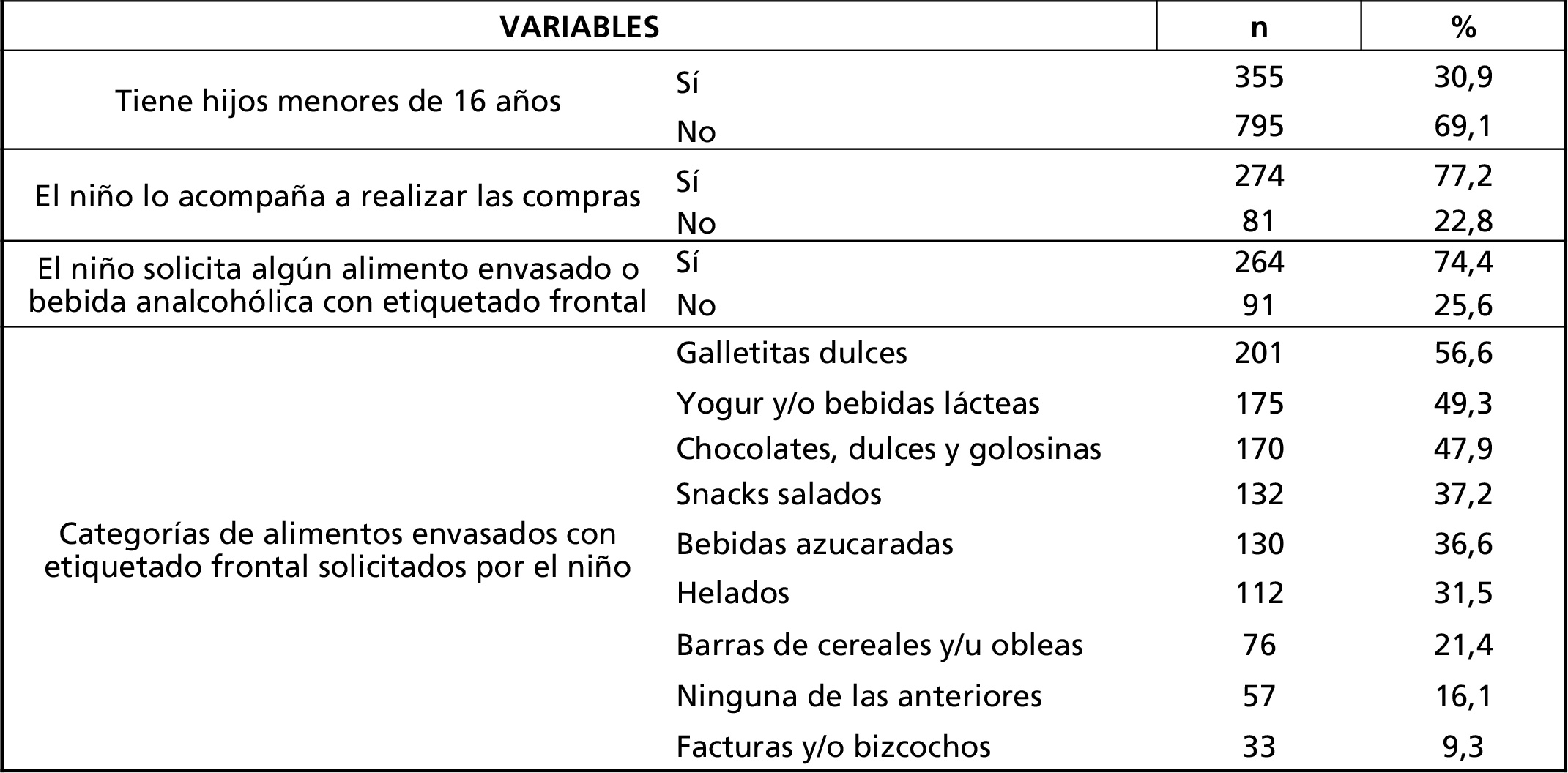 En cuanto a la influencia de los hijos en las compras de alimentos realizadas por sus padres, el 30,9 % de los encuestados tenían hijos menores de 16 años, de estos, el 77,2 % llevaba a sus hijos de compras y el 74,4 % recibía solicitudes de alimentos con etiquetado frontal por parte de sus hijos. Las categorías de alimentos más solicitadas por los niños eran galletitas dulces, yogur y/o bebidas lácteas y chocolates, dulces y golosinas con porcentajes de 56,6 %, 49,3 % y 47,9 % respectivamente (Tabla 4).
