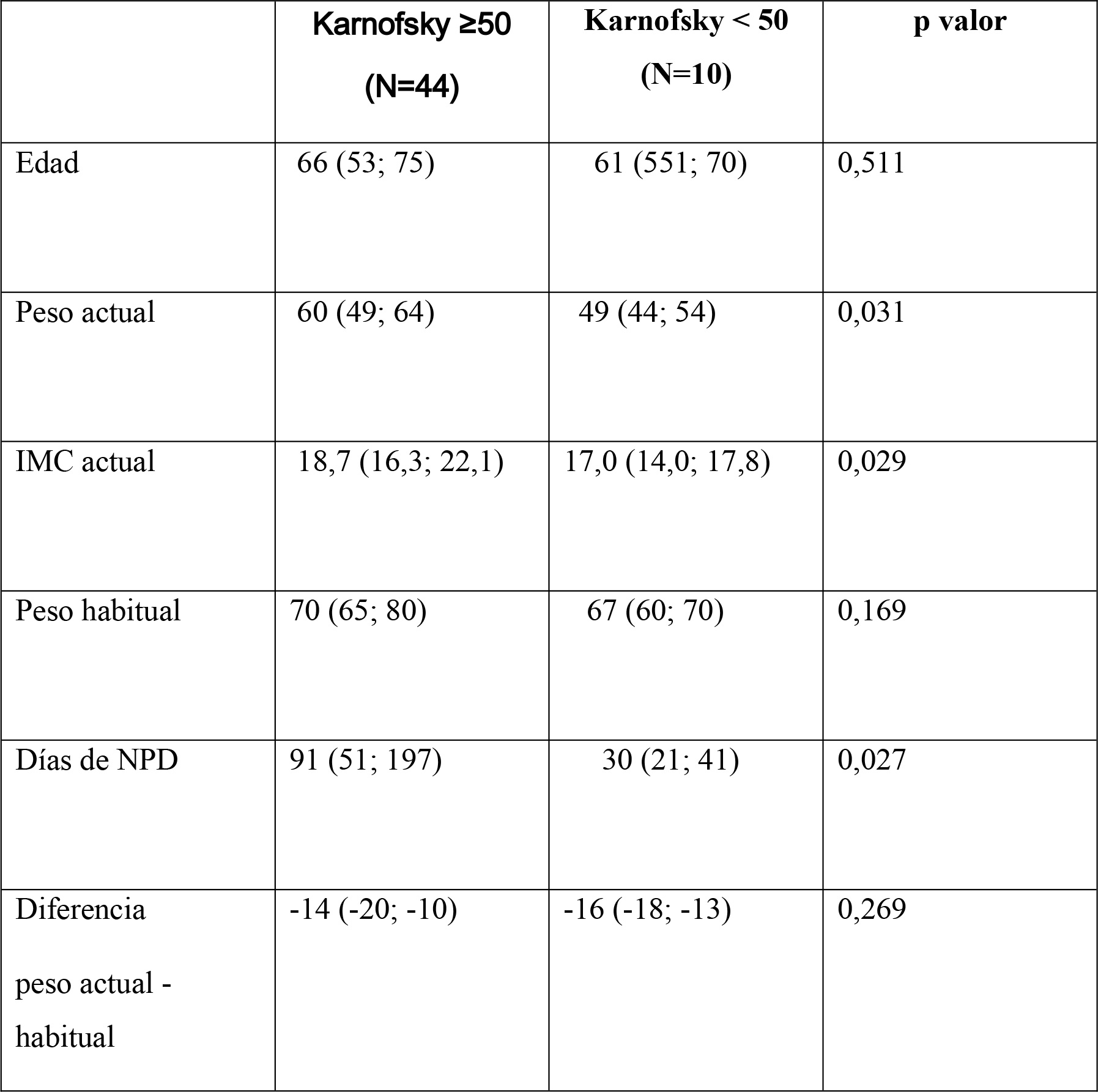 Resultados: 54 pacientes fueron evaluados (61,4% femeninos). Edad media 65 (53,3; 74 años. Los catéteres utilizados fueron: de inserción periférica 36 (66,66%), tunelizados 17 (31,48%) y Porth a Cath 1 (1,8%). El PI medio fue de 54 (45; 63) Kg y el IMC inicial fue de 18,3 (15,6; 21,0). El rango PI/PH fue de -15,0 (-19,3; - 10,0) Kg. El estudio describe las diferencias entre pacientes con un IK KPS ≥50 y aquellos con in IK <50. La duración media de la NPD fue de 76,5 días (34,5; 165,3). La evolución de los pacientes mostró que 24 de ellos (44,4%) suspendieron la NPD y 30 pacientes (55,6%) fallecieron. Los pacientes con IK <50 presentaron un OR (IC95%): 9,86 (1,65; 189,7) (p=0,031). la correlación entre el IK y los días de NPD que resultó significativa (r=0,42, p=0,010).