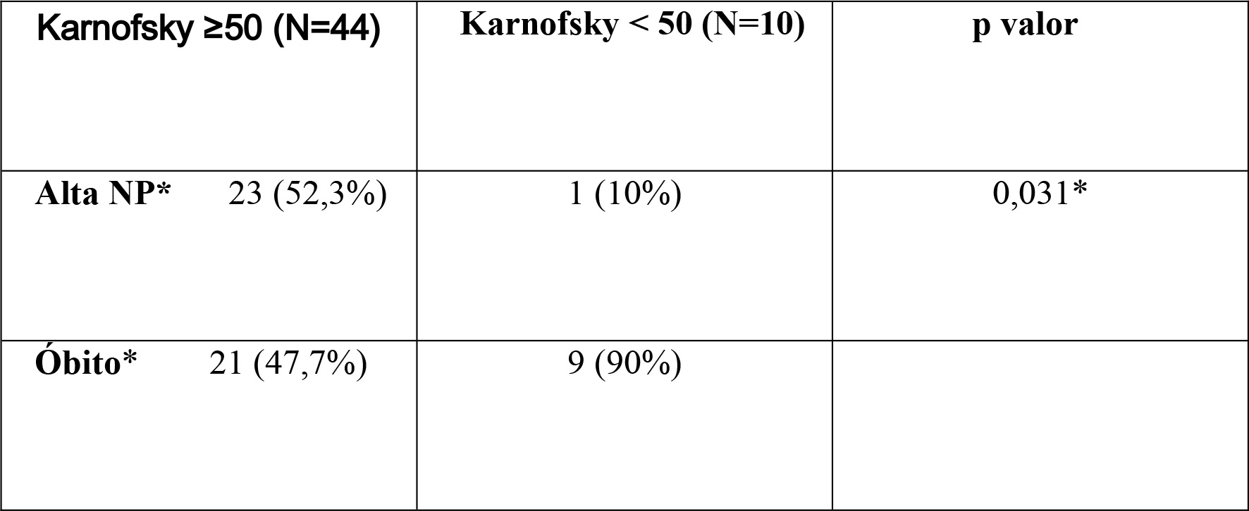 Tabla 2: Diferencias en la evolución (alta de NPD u óbito) entre pacientes que presentaron un Índice de Karnofsky <50 o ≥50