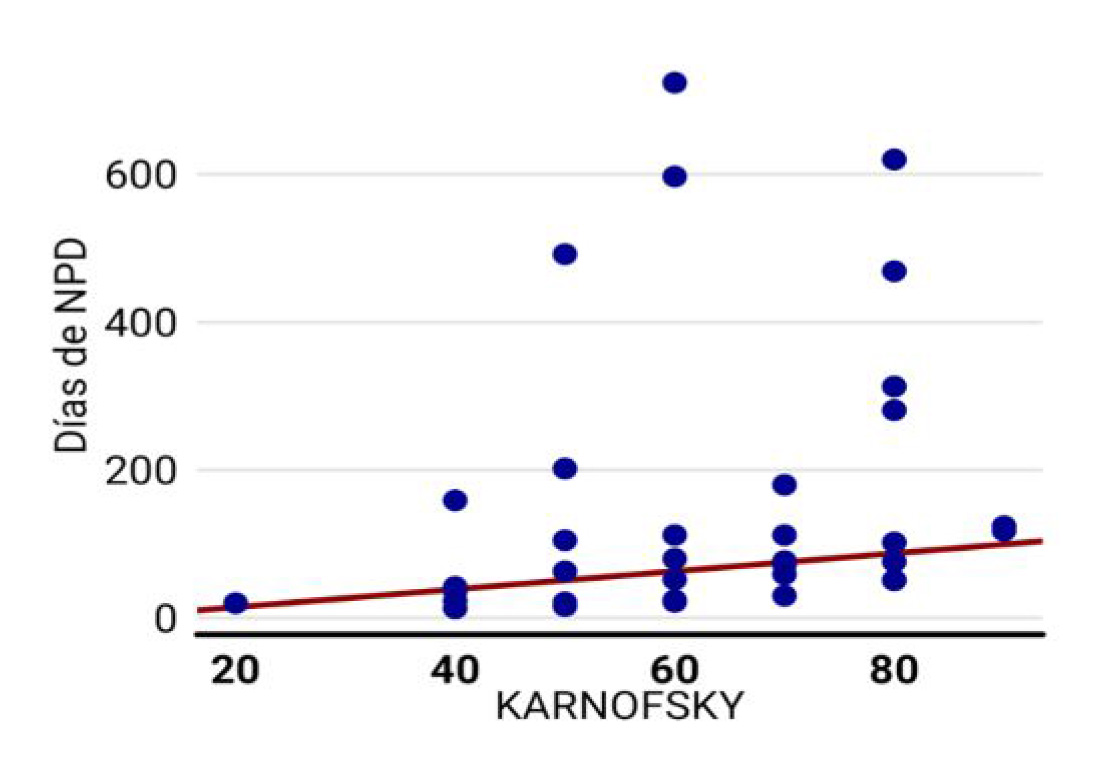 El gráfico 1 muestra el resultado de la correlación entre el Índice de Karnofsky y los días de NPD que resultó significativa (r=0,42, p=0,010).