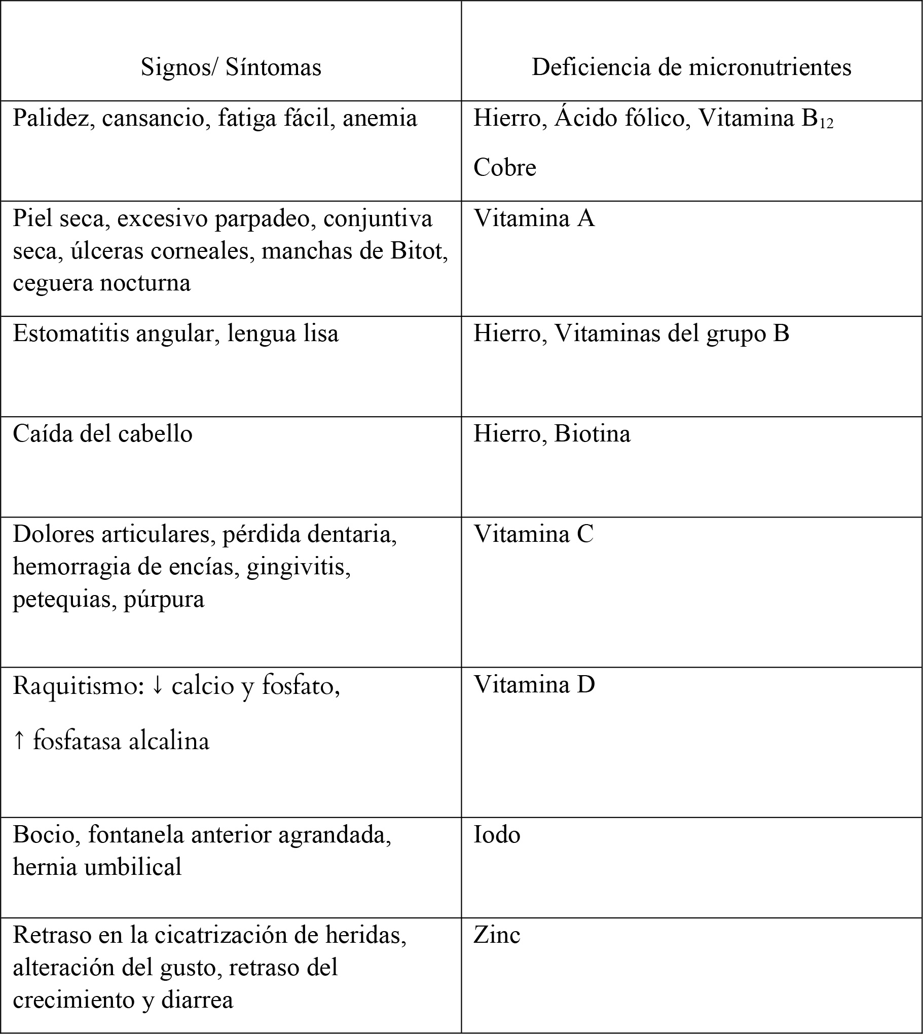Tabla 1: Signos y síntomas asociados a la deficiencia de micronutrientes