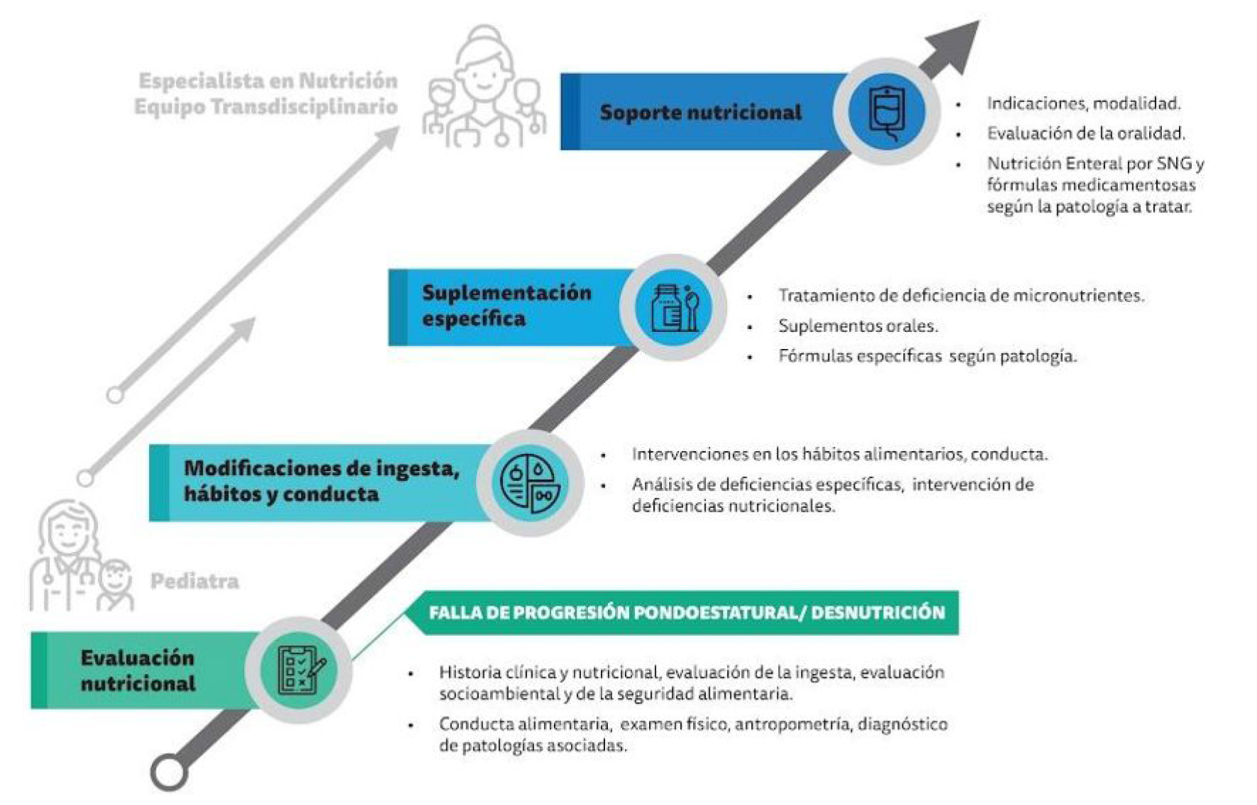 Figura 1: Descripción de las diferentes etapas en la toma de decisiones a partir de la evaluación nutricional y el diagnóstico de falla de progresión pondoestatural/desnutrición