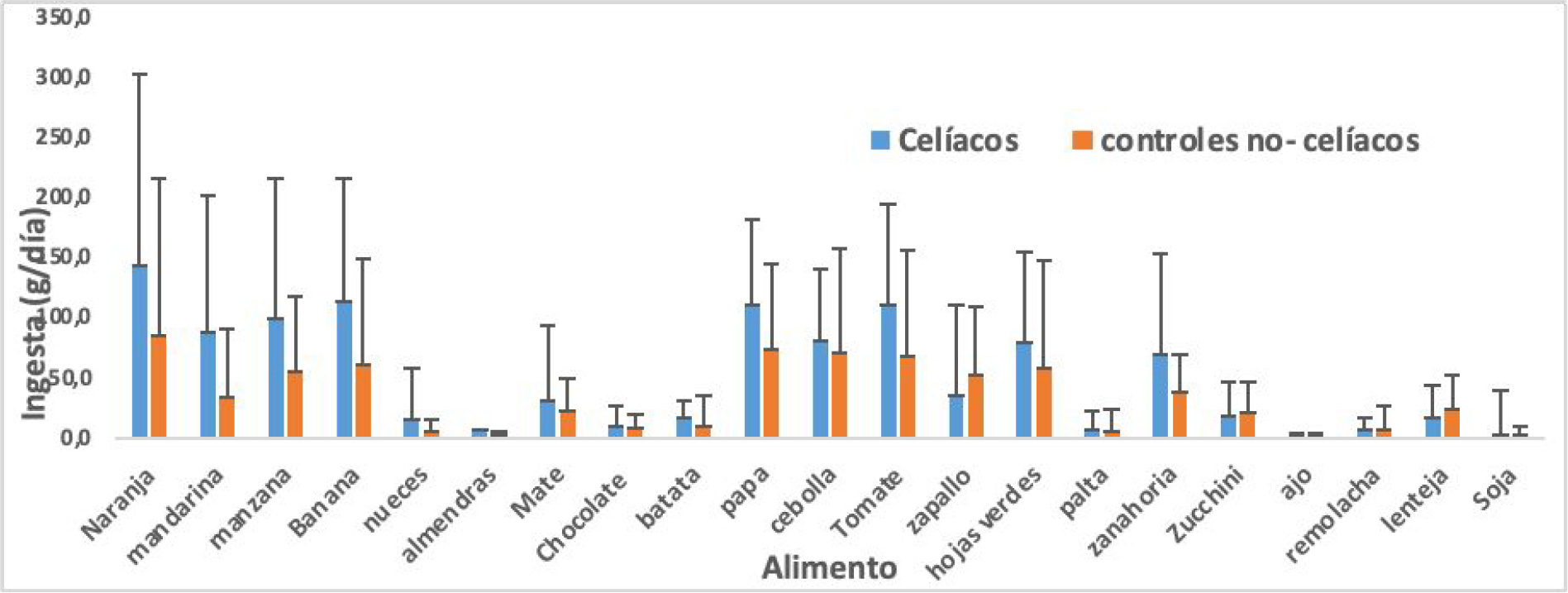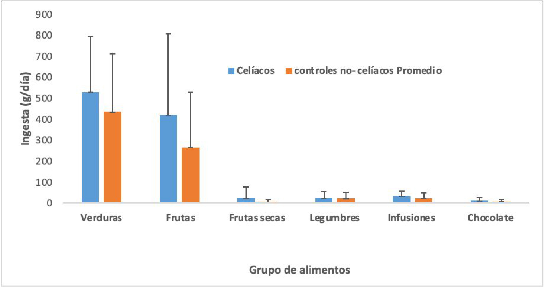 La ingesta por grupo de alimentos muestra en orden decreciente que las más ingeridas son las verduras seguidas de las frutas, infusiones, las frutas secas, y chocolate (Figura 2). El 71,0 % y el 48,5% de las personas con enfermedad celíaca y controles no celíacos respectivamente consumían 5 o más porciones diarias de frutas y verduras (600 g/día); en tanto, las ingestas promedio diarias en los dos grupos encuestados cumplían con esas recomendaciones.