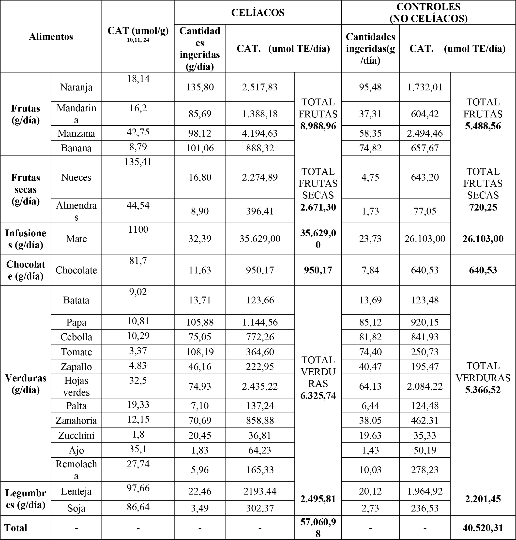 En relación con frutas y verduras, el 71 % y el 46,0 % de las personas con enfermedad celíaca y controles no celíacos respectivamente mostraban valores de CAT mayor o igual (≥) a 12.029 TE/día, compatibles con consumos diarios de 600 gramos de esos alimentos.