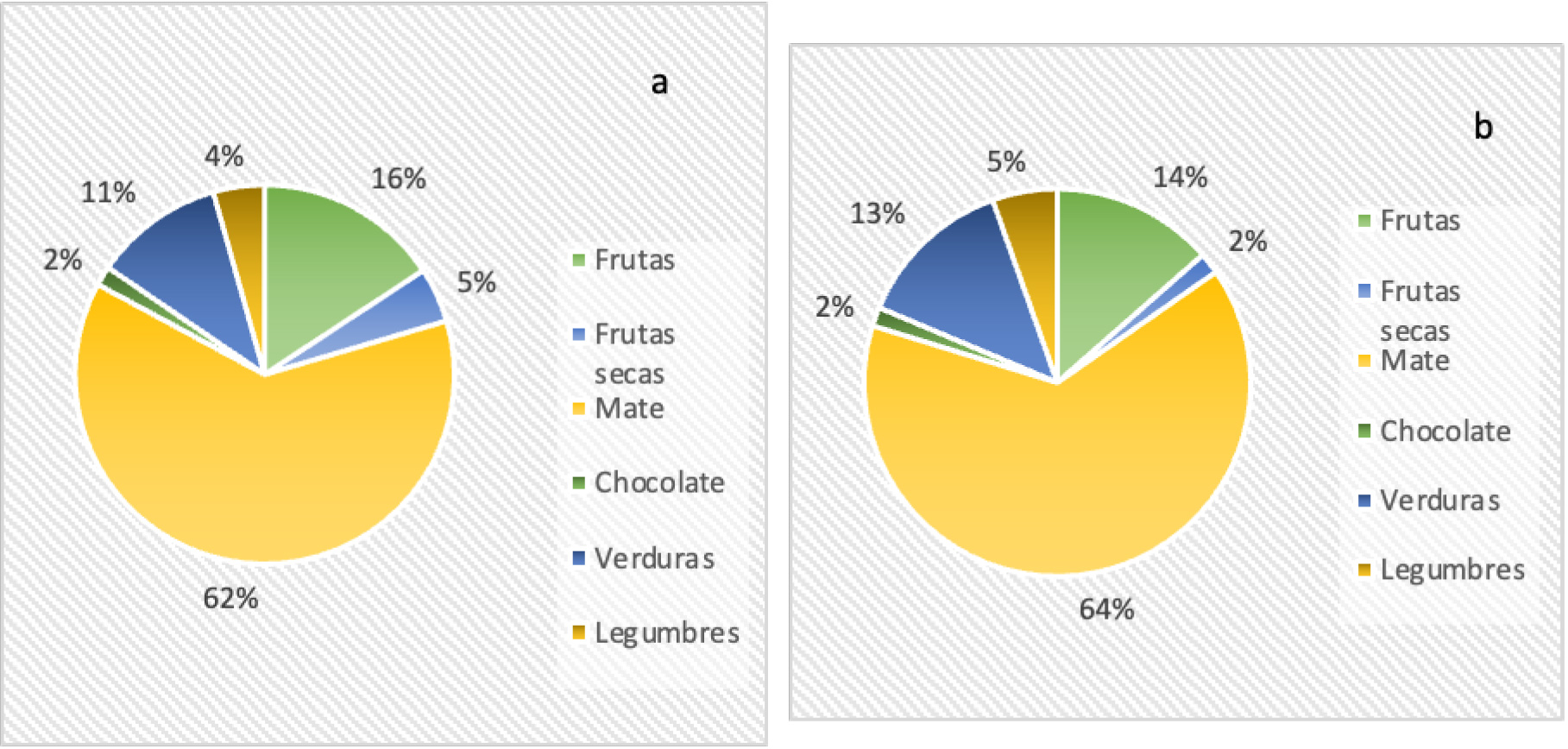 Cuando se analizó el aporte de compuestos antioxidantes provenientes de la dieta, medidos como capacidad antioxidante total (CAT), se encontró que el mate fue el mayor contribuyente a la ingesta total de antioxidantes de los alimentos encuestados. En pacientes celíacos y controles no celíacos, la contribución promedio de la ingesta de mate al consumo de antioxidantes totales fue del 62% y del 64% respectivamente (Fig. 3 a y b).