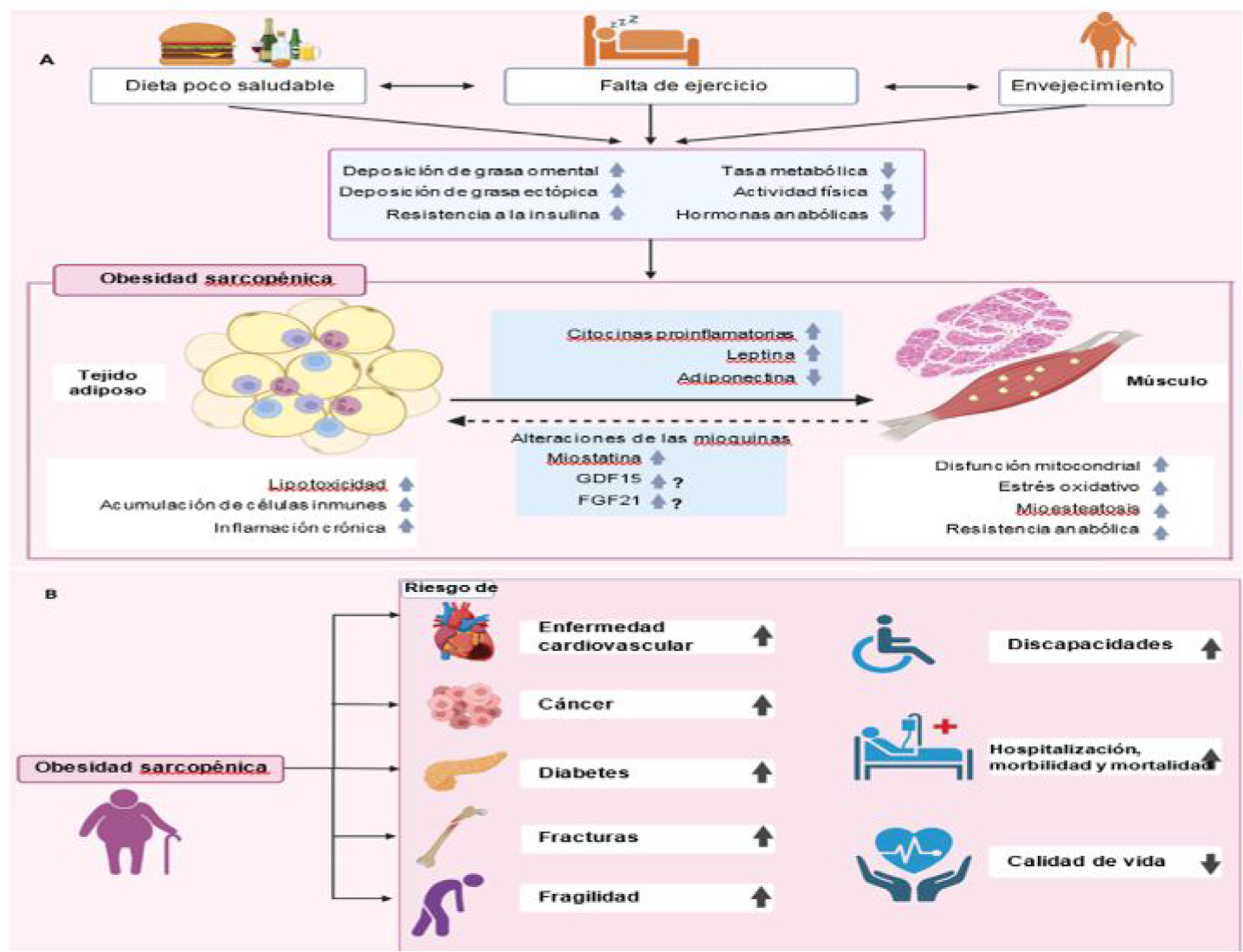 | GDF15, factor de diferenciación de crecimiento 15; FGF21, factor de crecimiento de fibroblastos 21. B) Como resultado de la obesidad sarcopénica, existe un mayor riesgo de enfermedad cardiovascular, cáncer, diabetes, fracturas y fragilidad, así como hospitalizaciones, morbilidad y mortalidad, discapacidad y disminución de la calidad de vida. |