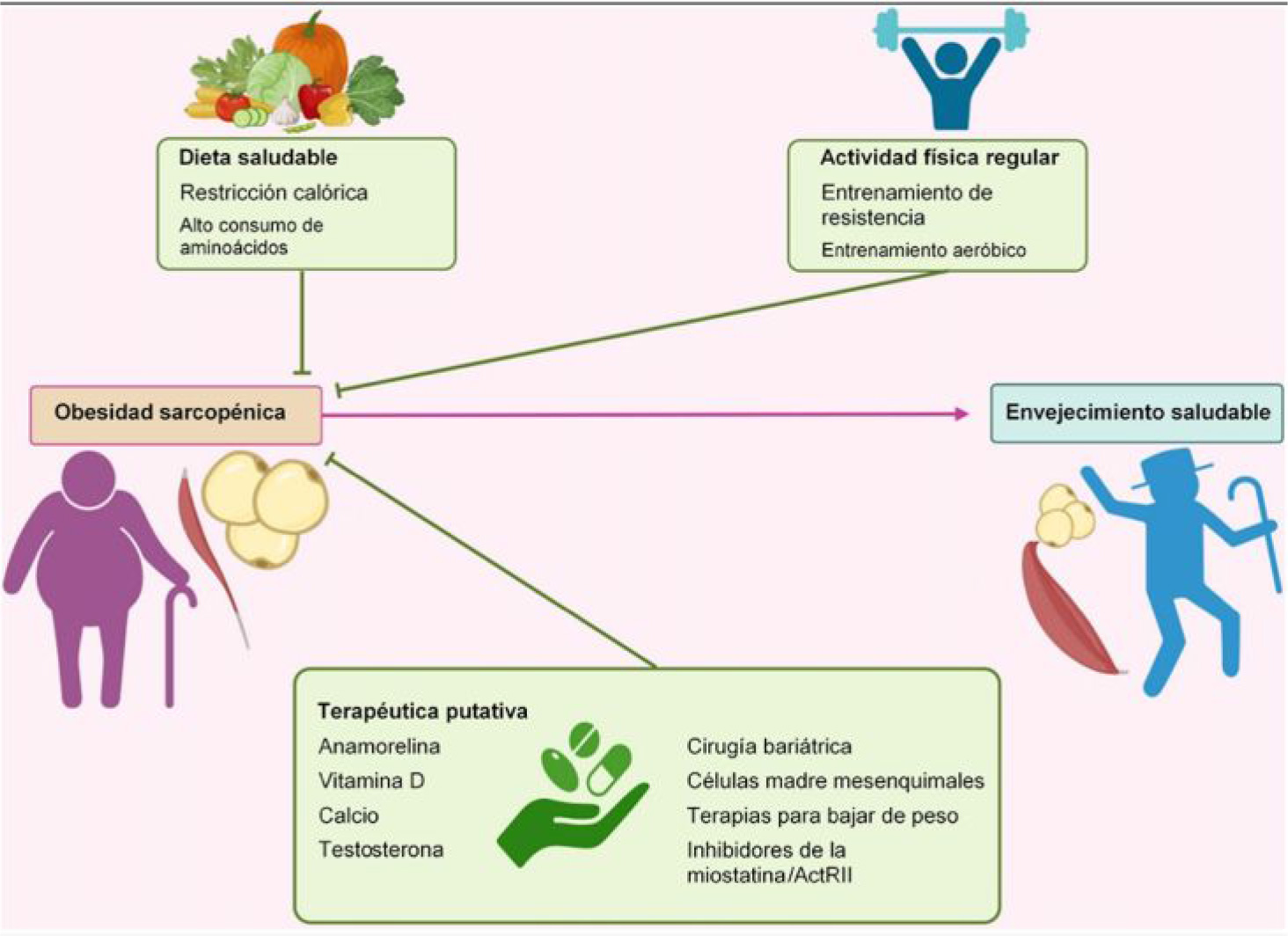 | Se proponen varios enfoques terapéuticos contra la obesidad sarcopénica. La restricción calórica podría considerarse con cautela, especialmente en sujetos de edad avanzada asociados con la ingesta de proteínas de alta calidad. La actividad física es una piedra angular en el manejo de la obesidad sarcopénica y debe combinar ejercicios aeróbicos y de resistencia. Se consideran varios tratamientos farmacológicos e incluyen inhibidores de la miostatina, anamorelina, vitamina D, testosterona y moduladores selectivos del receptor de andrógenos, y terapias para la pérdida de peso. ActRII, receptor de Activina tipo II. |
