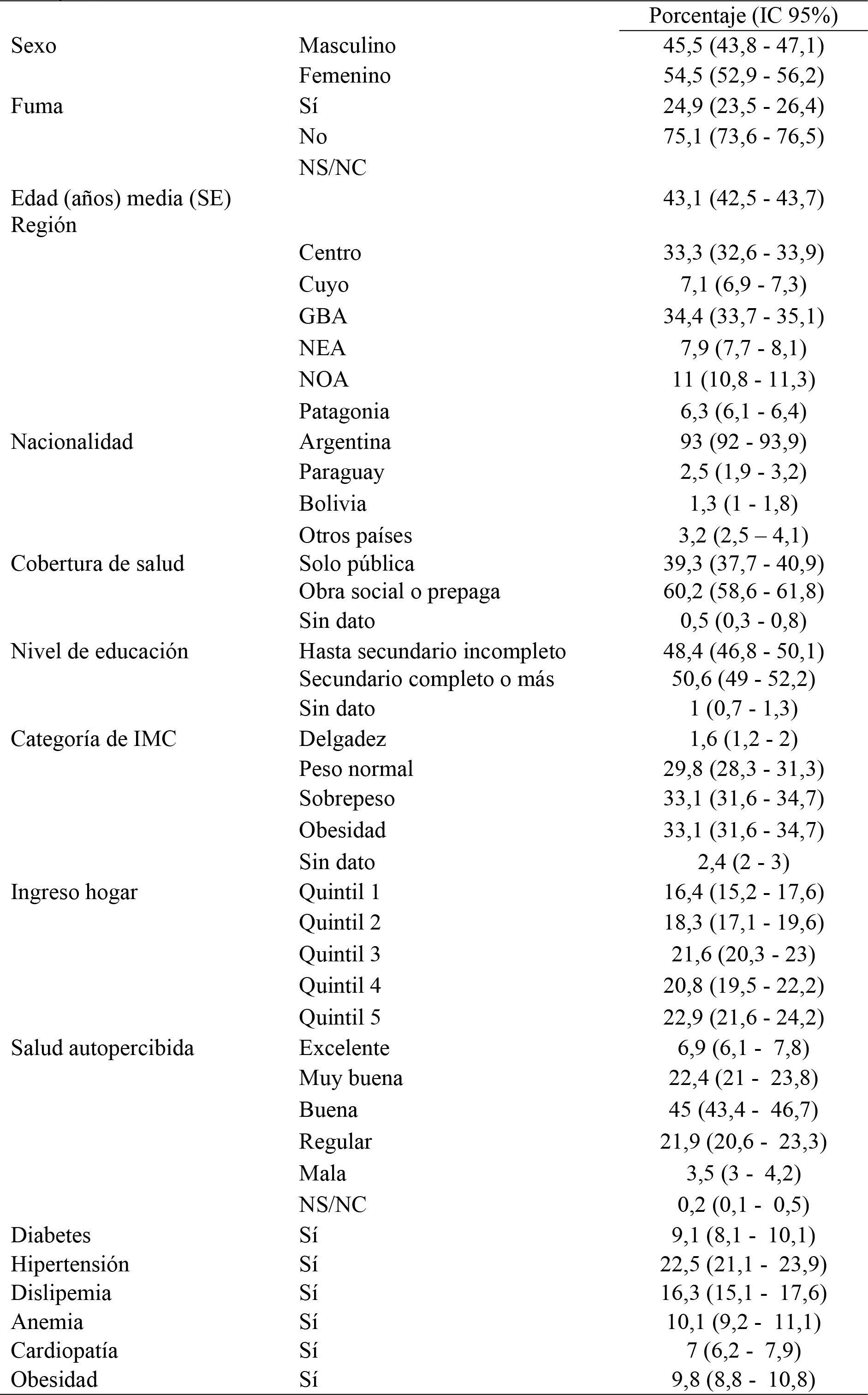 La muestra analizada estuvo compuesta por 7.294 individuos, representativos de 24.496.908 adultos argentinos a nivel nacional. De ellos, el 54,5% eran mujeres y el 45,5% varones, con una edad media de 43,1 años. La mayoría de los participantes contaba con cobertura de obra social o prepaga (60,2%) y nivel educativo secundario completo o superior (50,6%) (Tabla 1).