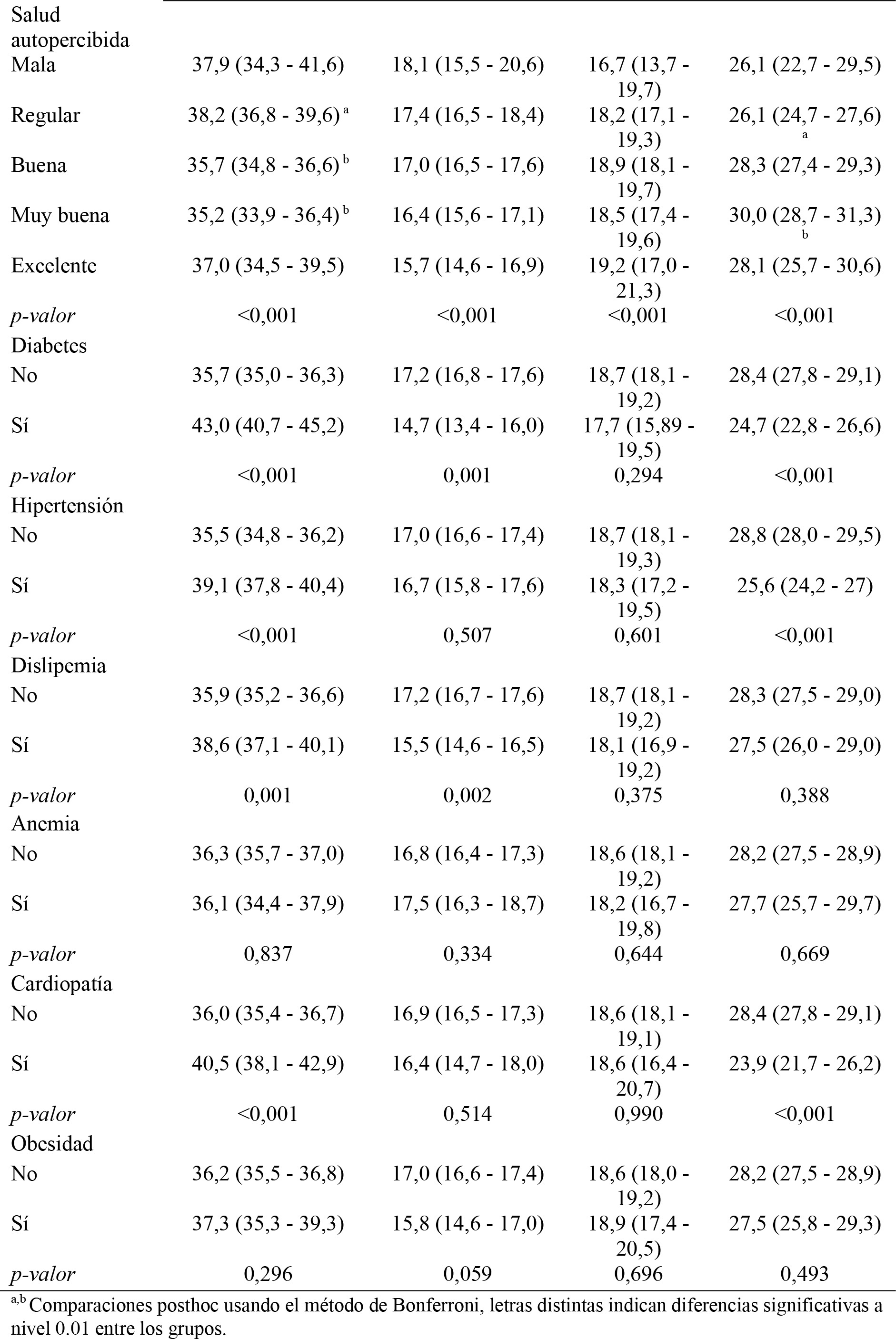 En cuanto a la salud autopercibida, las personas que percibían su estado de salud como "muy bueno" presentaron mayor consumo de AUP respecto de los que lo percibían como "regular" (30,0% vs 26,1%; p<0,001). En cuanto a las condiciones de salud autorreportadas, se observó un menor consumo de AUP en aquellos que refirieron padecer diabetes, hipertensión y cardiopatías (p<0,001) (Tabla 4).