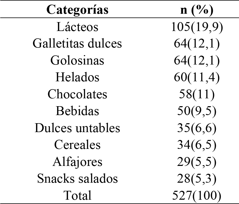 El tipo de muestreo utilizado fue no probabilístico intencional. La muestra se integró con productos ultraprocesados categorizados en: galletitas dulces (simples, rellenas, obleas), alfajores (simples, triples), chocolates (tabletas, bombones y bocaditos), golosinas (caramelos duros, blandos, de goma, chupetines, confitados), helados (helados y potes, postres y tortas, palitos y paletas, palitos de agua), cereales (cereales de desayuno, barras de cereal), bebidas (gaseosas, aguas saborizadas, jugos listos para consumir), dulces untables (mermeladas, dulce de leche, pasta a base de almendras, avellanas, maní), snacks salados (galletitas de copetín, papas fritas, productos a base de maíz) y lácteos (chocolatada, yogur bebible, yogur en pote, postres). Los aspectos metodológicos específicos, tales como los criterios de inclusión, exclusión y el procedimiento de recolección de datos pueden consultarse en profundidad en la publicación original13.