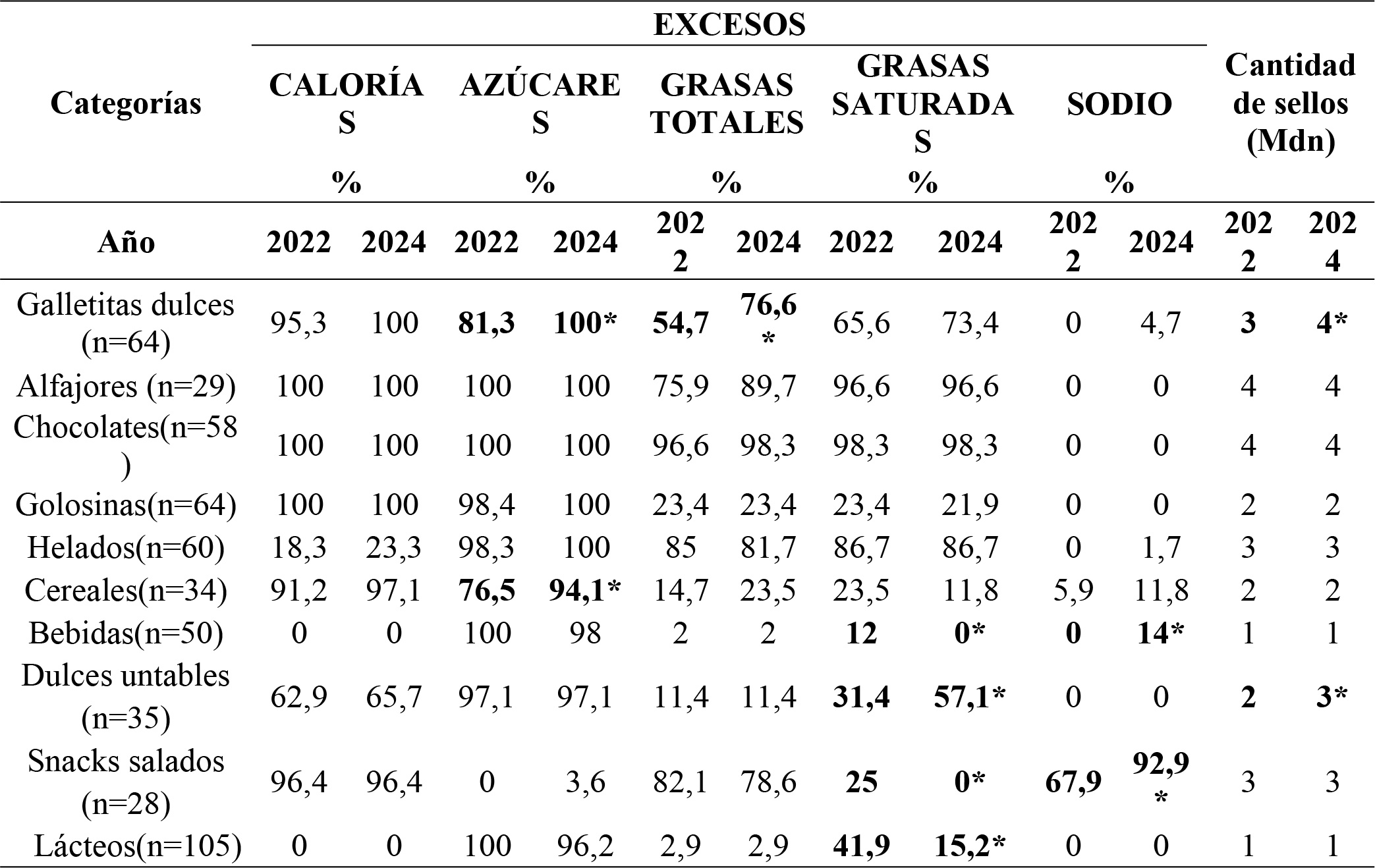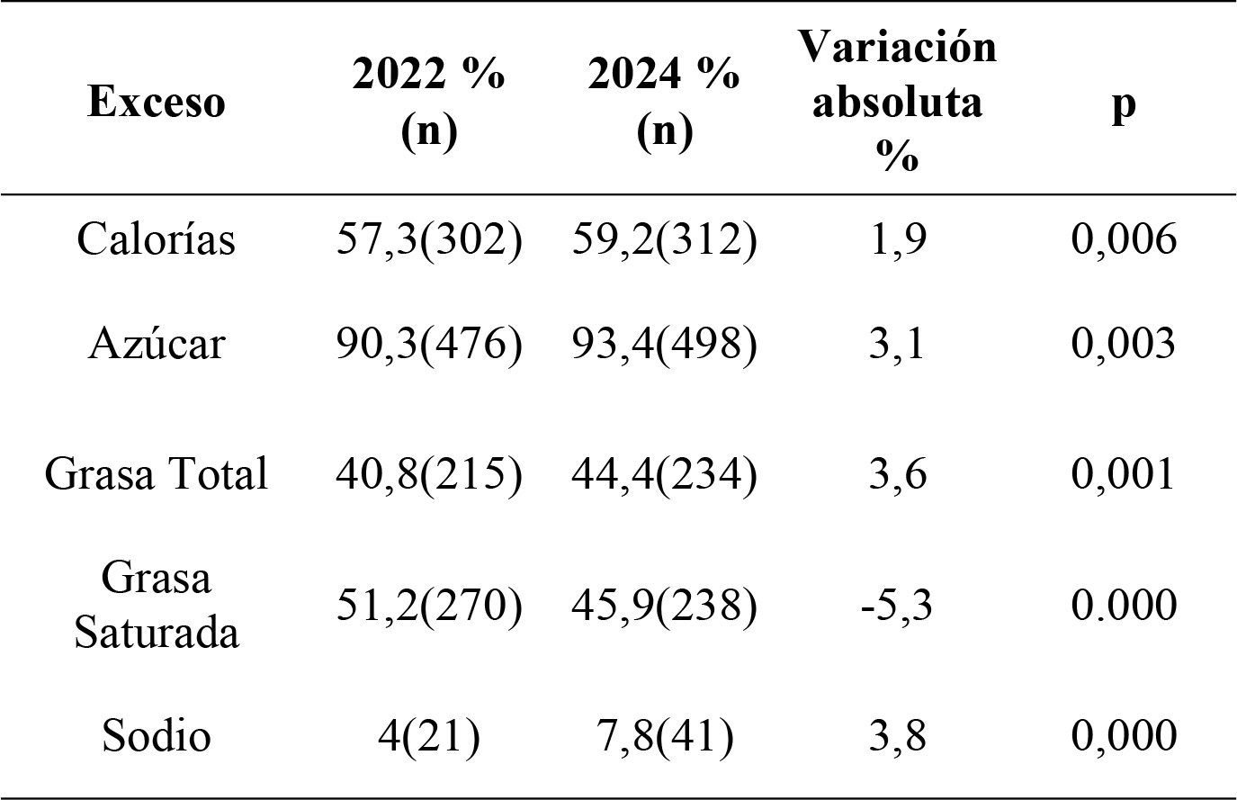 Los productos que experimentaron un aumento significativo en el EXCESO EN AZÚCARES fueron los cereales (76,5 % vs 94,1 %, p=0,031) y las galletitas dulces (81,3 % vs 100 %, p=0,000). Ésta última, también experimentó un aumento del EXCESO EN GRASAS TOTALES (54,7 % vs 76,6 %, p=0,000). Además, el EXCESO EN GRASAS SATURADAS. aumentó significativamente en los dulces untables (31,4 % vs 57,1 %, p=0,004).