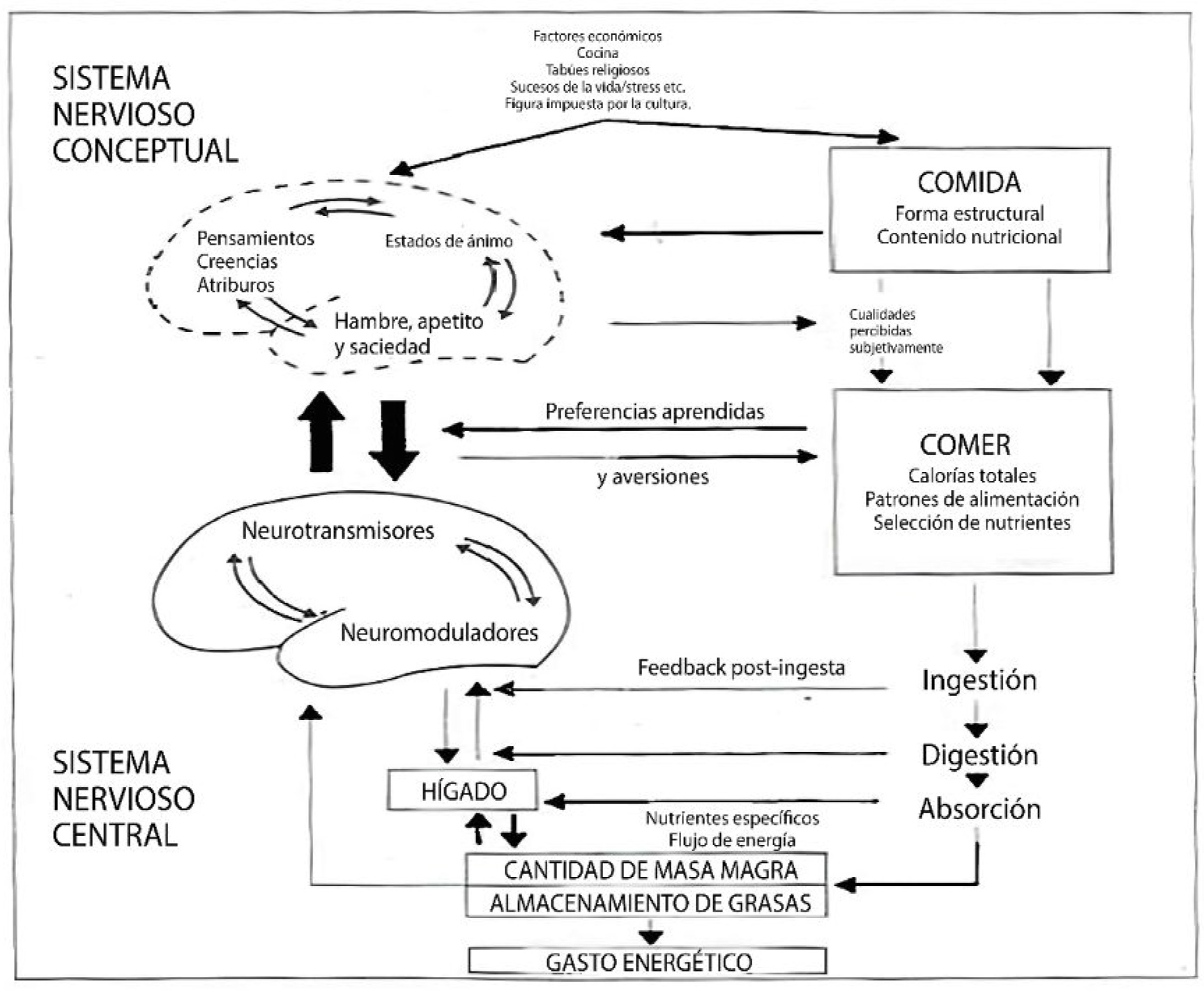 | Figura 1: Conceptualización del sistema biopsicológico subyacente del control de la conducta alimentaria. A la derecha, el sistema periférico; a la izquierda, el sistema nervioso central |